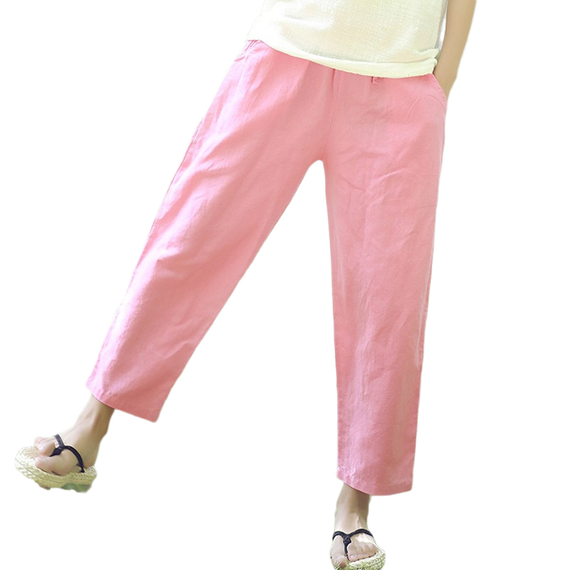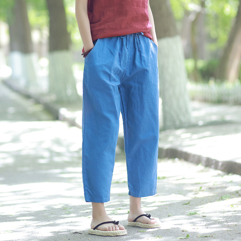 夏季新款棉麻文艺休闲纯亚麻九分七分裤小脚裤松紧腰系带百搭女裤