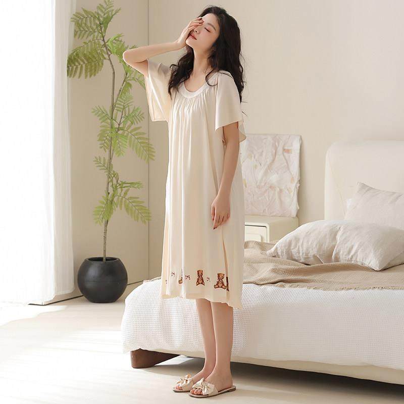 哺乳睡裙女款带胸垫夏季睡衣薄款喂奶孕妇待产后绣连衣裙冰丝丝绸