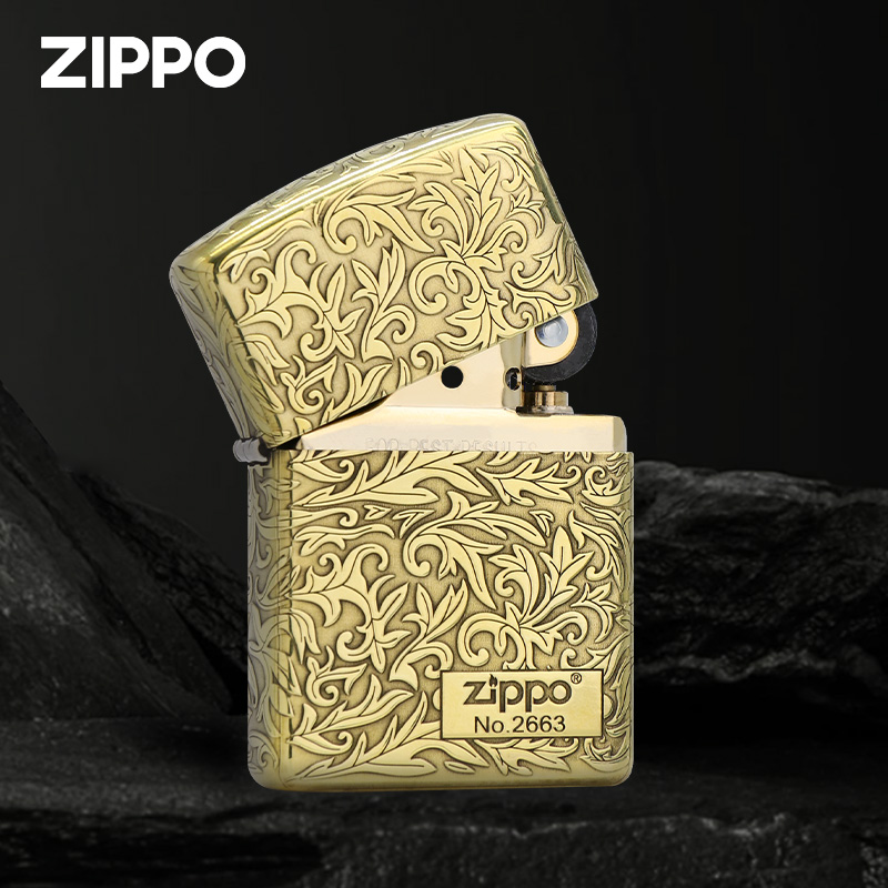 zippo煤油防风打火机黄铜盔甲精雕唐草富贵花五面花纹生日礼物