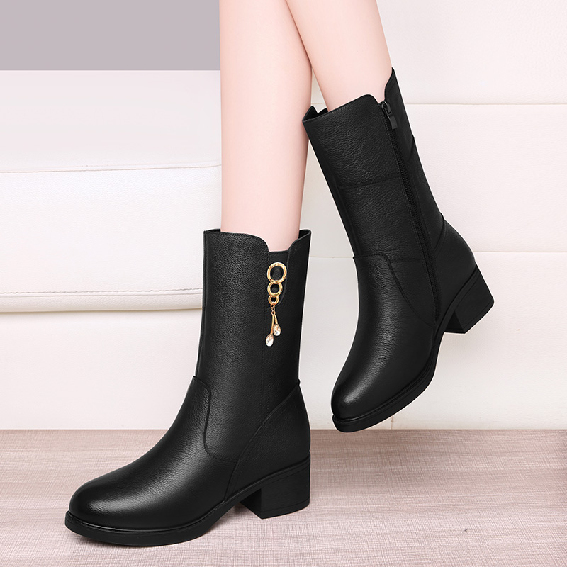 富贵鸟真皮中筒靴子短靴2025新款春秋季小个子中跟单靴软底妈妈鞋