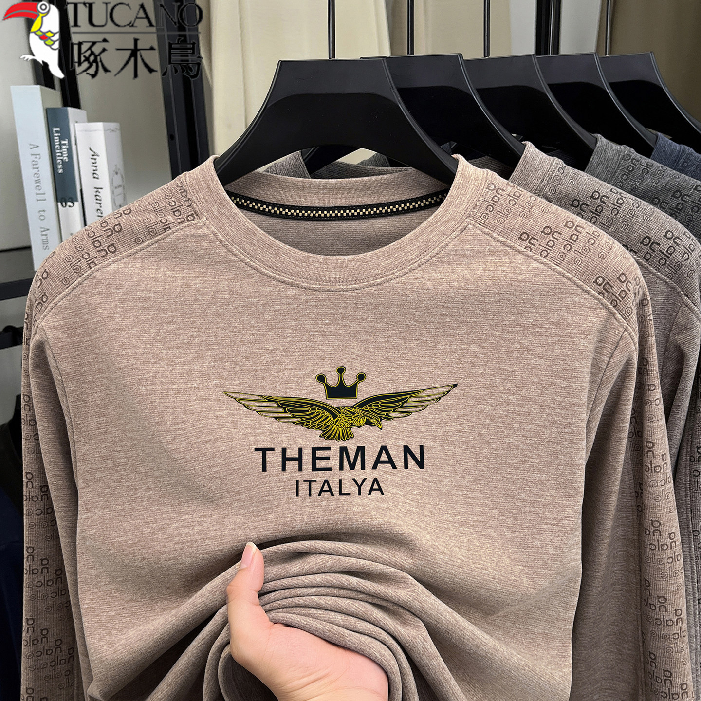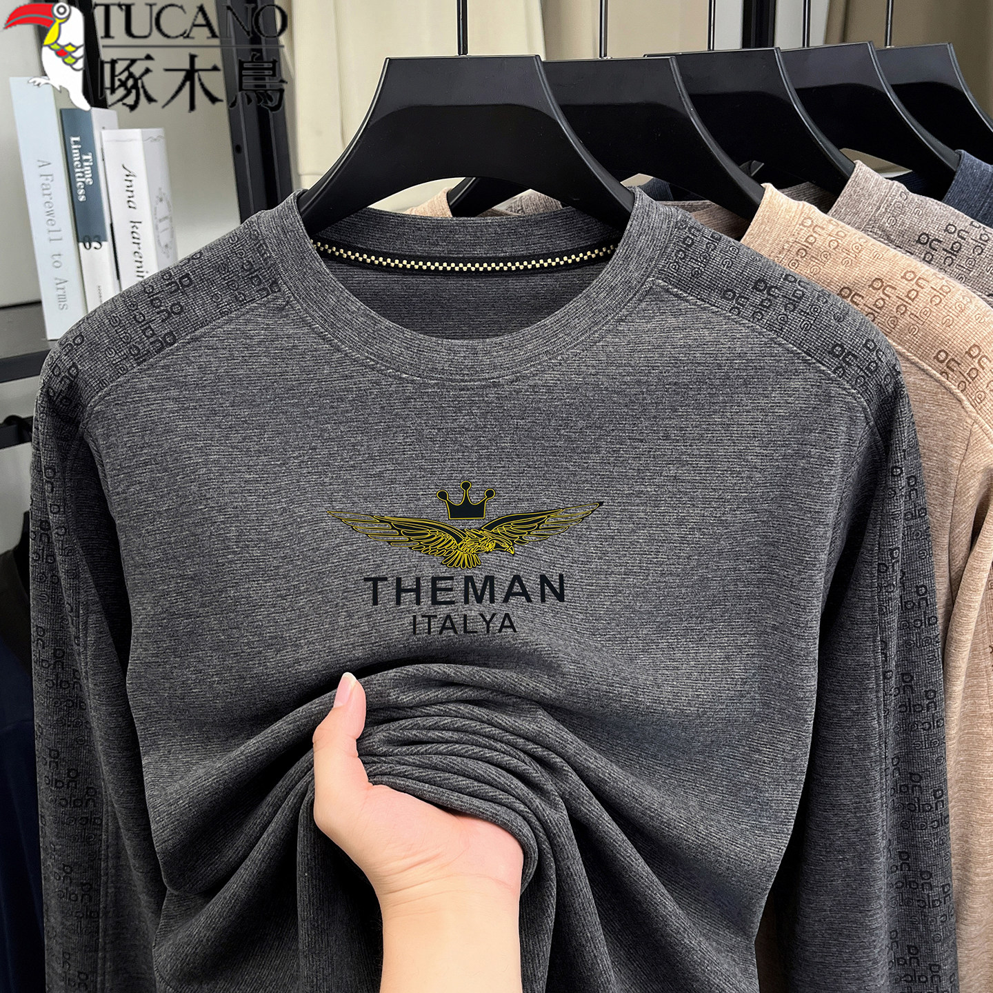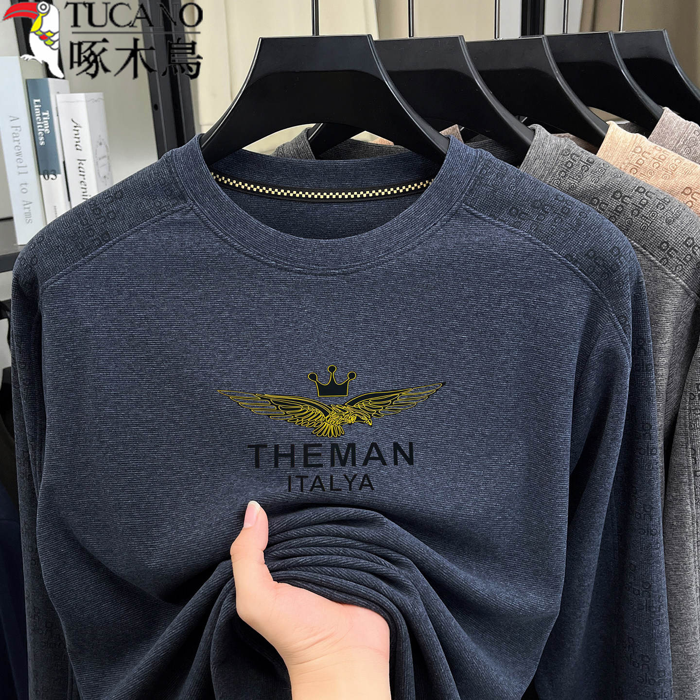 啄木鸟纯棉卫衣男士长袖t恤春秋季中青年圆领宽松上衣休闲打底衫