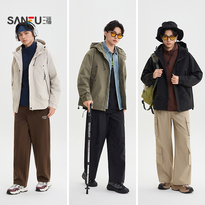 三福2025冬季男士户外抽绳冲锋衣棉衣 宽松连帽保暖外套505922