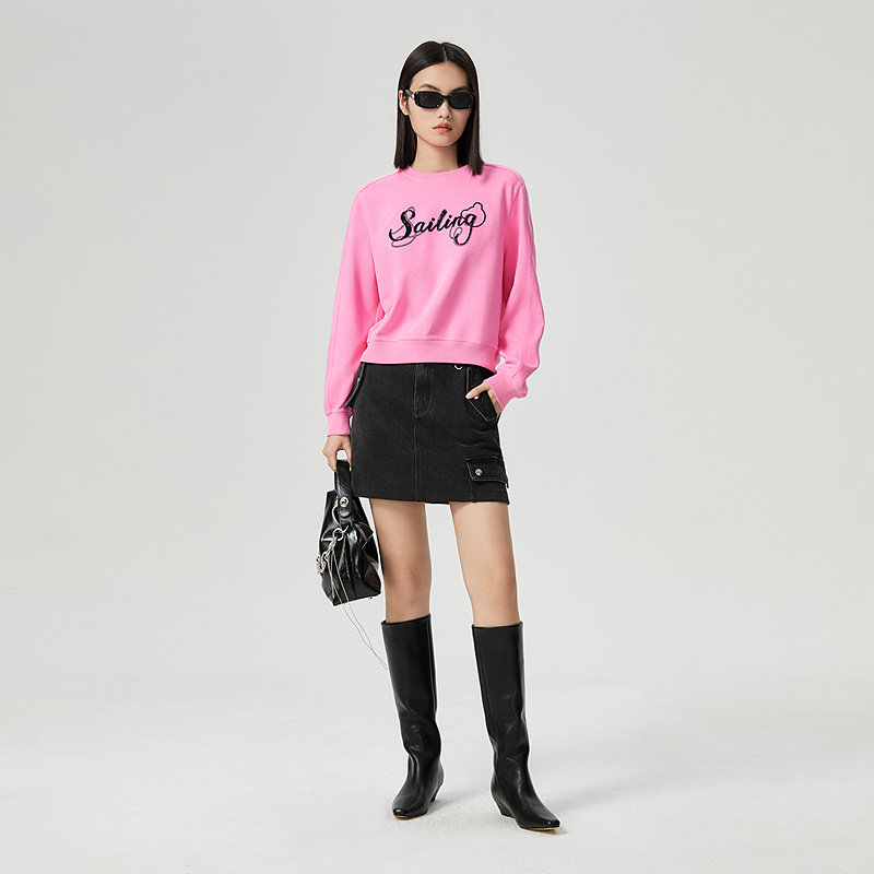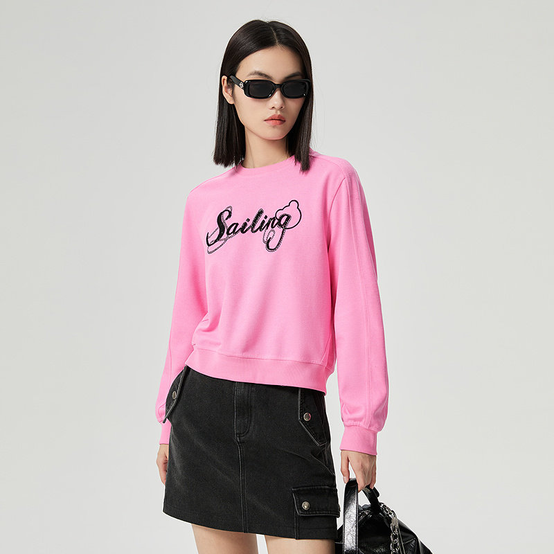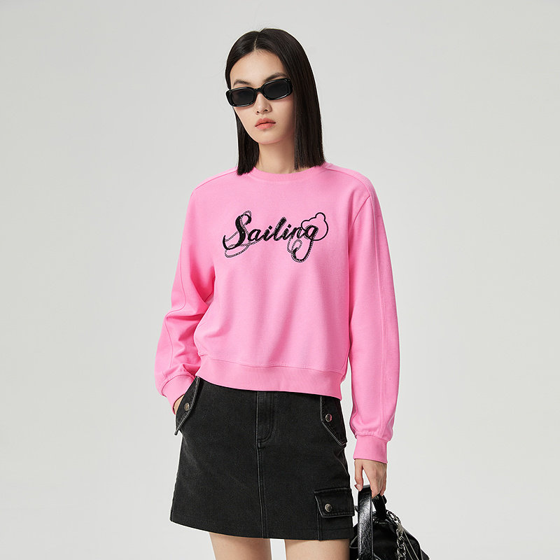 普普风商场同款秋冬新款粉色套头圆领宽松简约重工刺绣撞色卫衣女