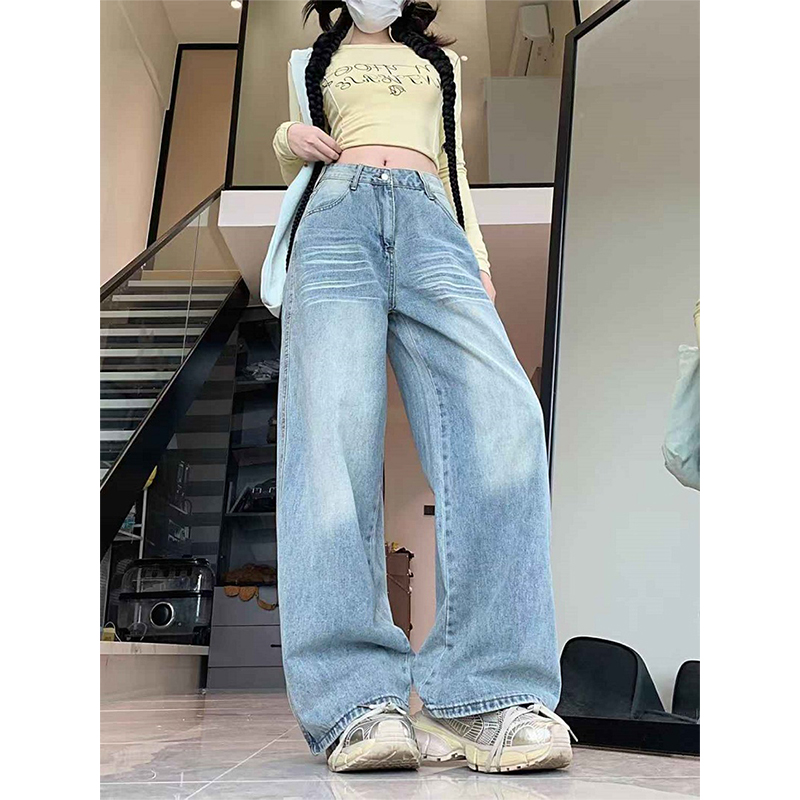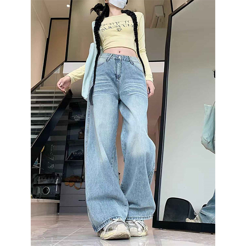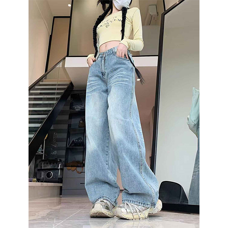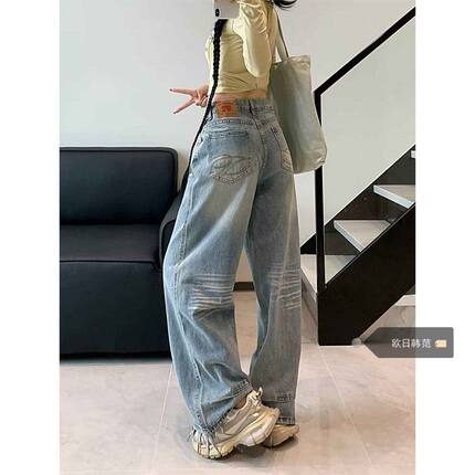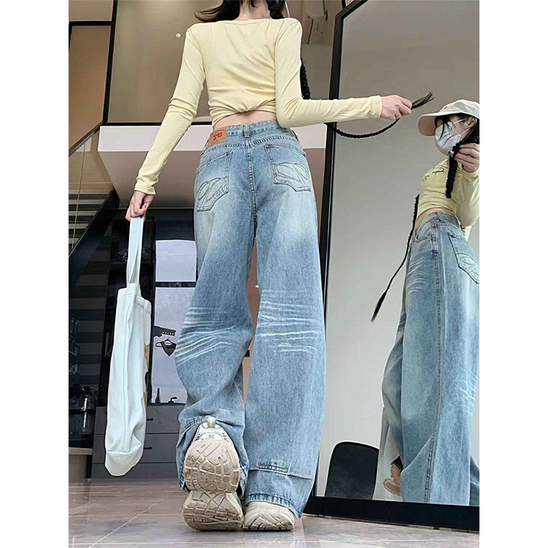 大码复古高个子口袋刺绣设计感牛仔裤女秋冬新款显瘦宽松阔腿裤子