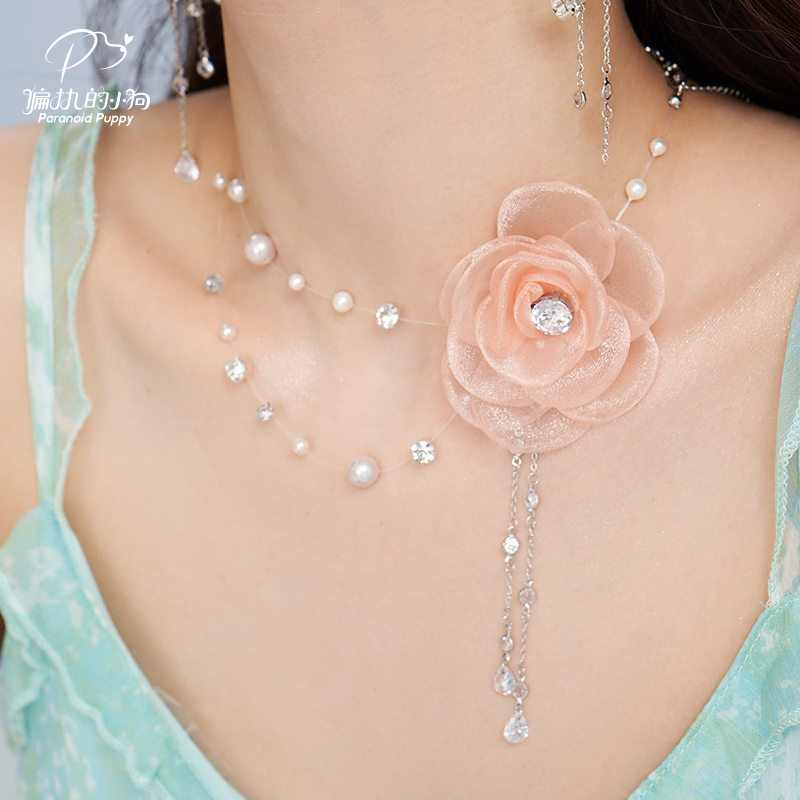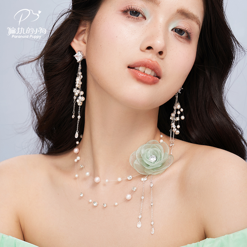 PP饰品《协奏曲》薄纱绿色花朵流苏珍珠项链女小众轻奢气质锁骨链