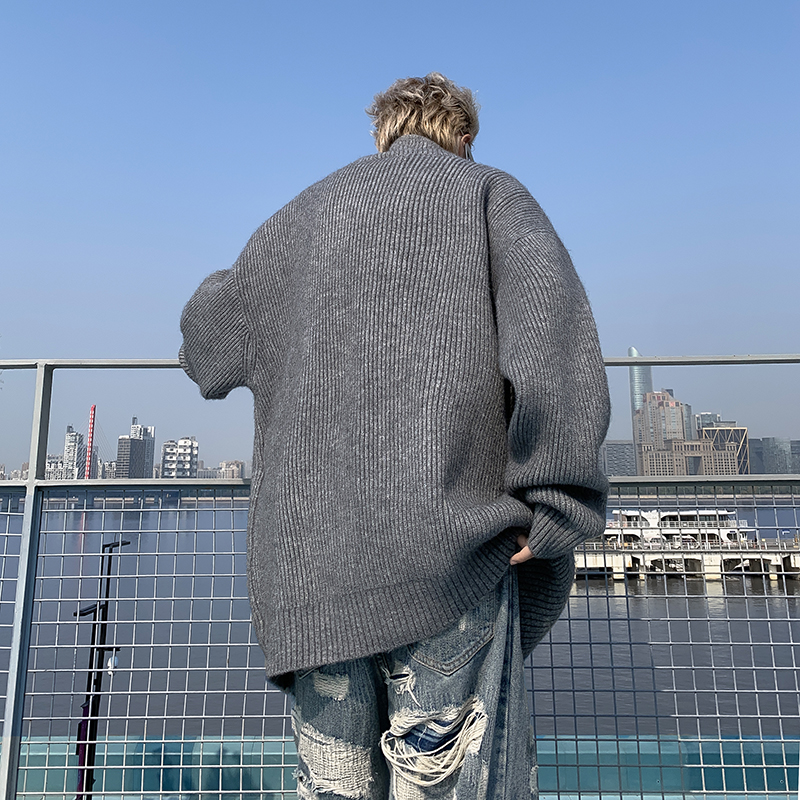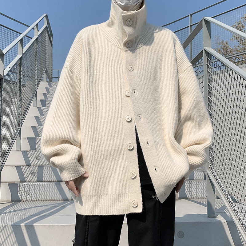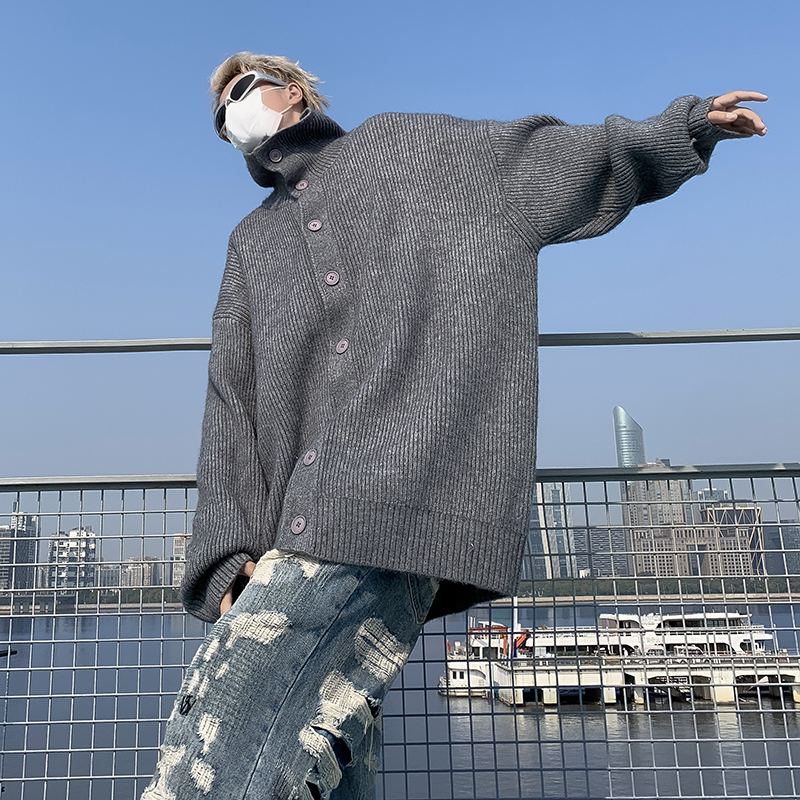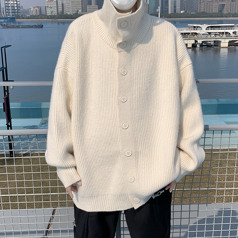 纯色高领单排纽扣针织开衫男韩系秋冬款ins潮流鹿毛绒高级感毛衣