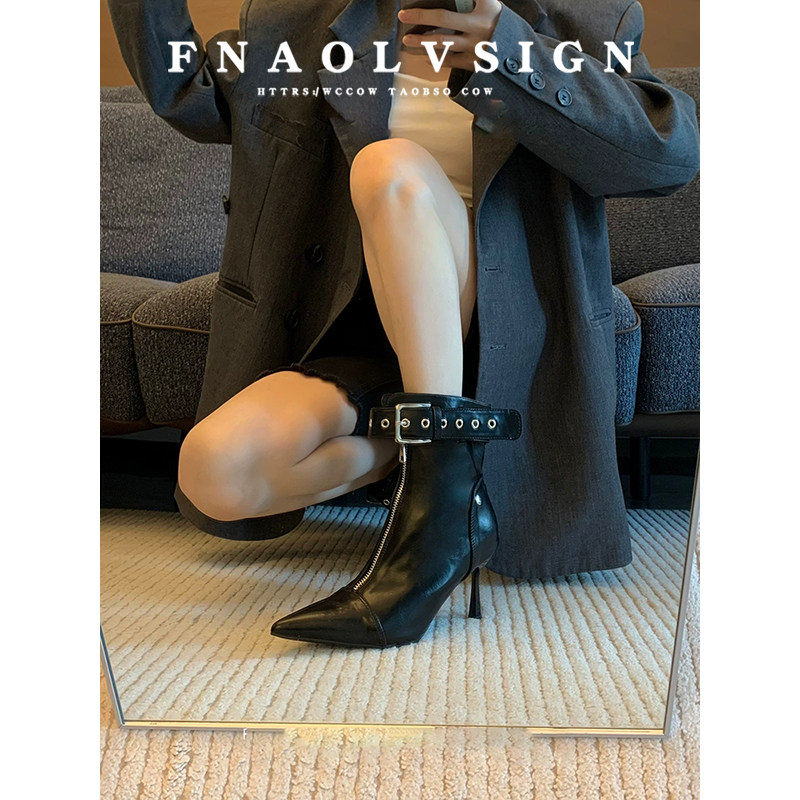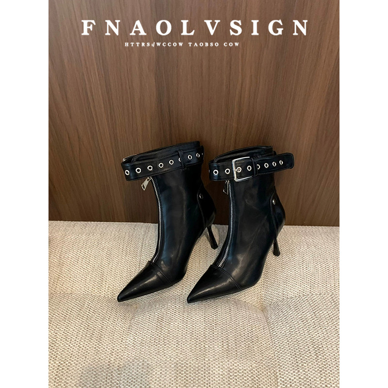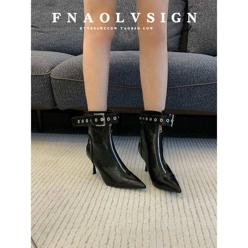 羊皮版~朋克铆钉皮带扣尖头短靴欧美气质细跟高跟靴真皮弹力靴女