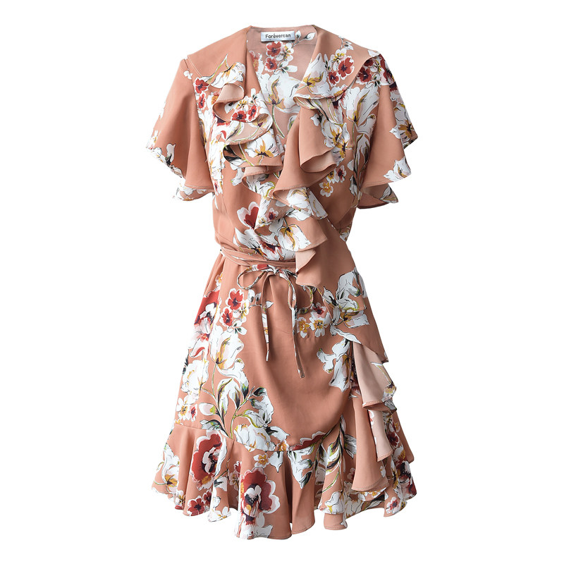 can夏季浪漫显瘦V领印花连衣裙