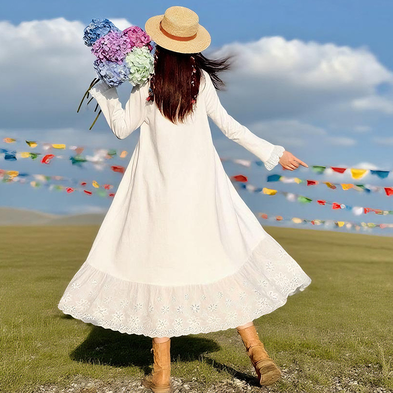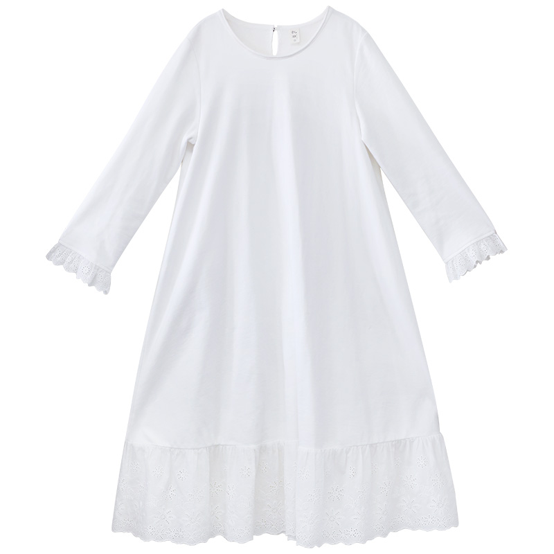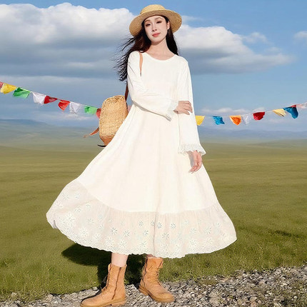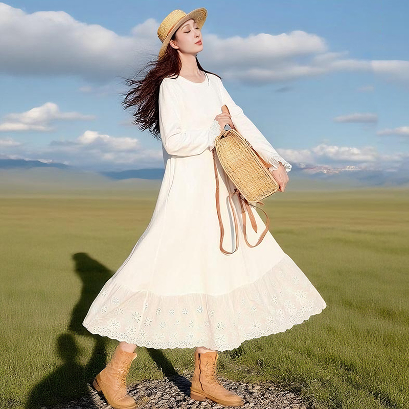 【白茶清欢】百搭针织连衣裙女款2025秋季拼接镂空刺绣蕾丝花边裙