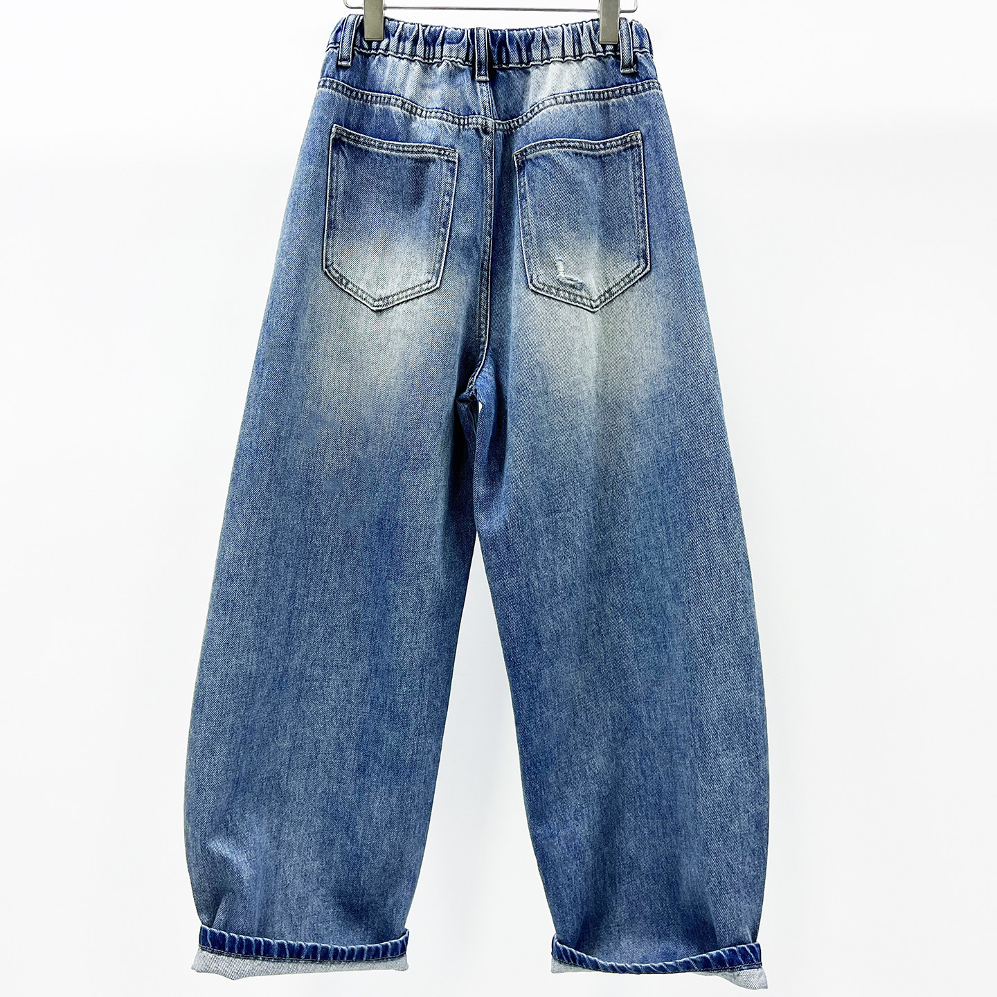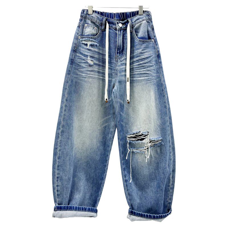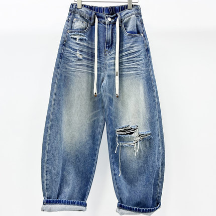 牛道途2026春季新款破洞宽松牛仔女弯刀裤松紧腰香蕉裤显瘦镰刀裤