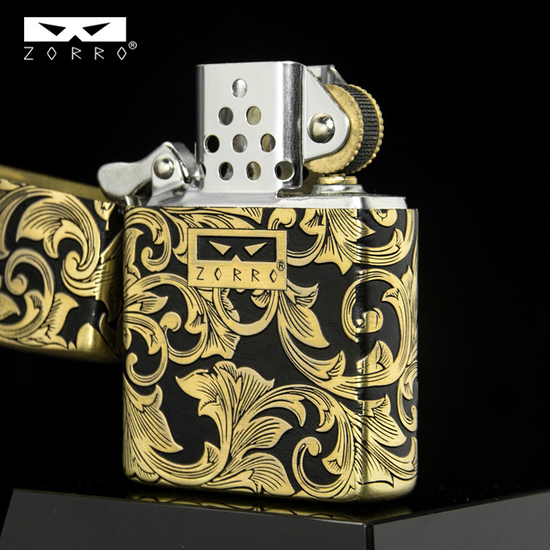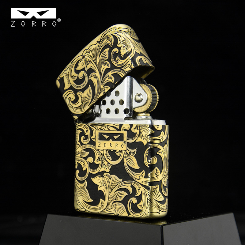 zorro佐罗正品煤油打火机砂轮防风纯铜二代眼镜标黑金色唐草花纹