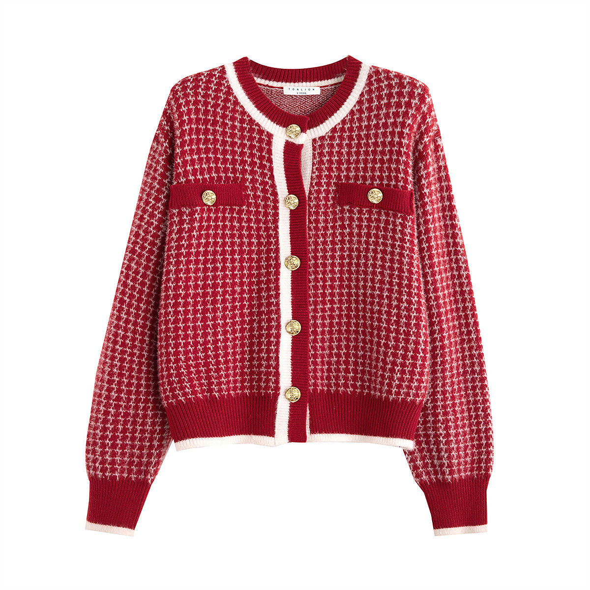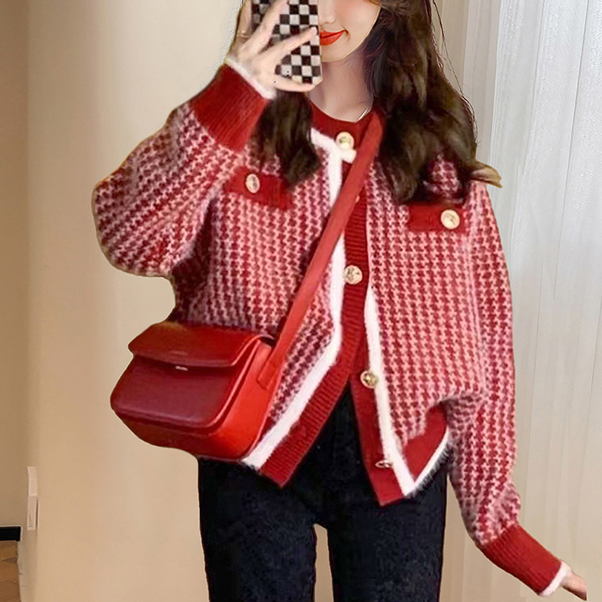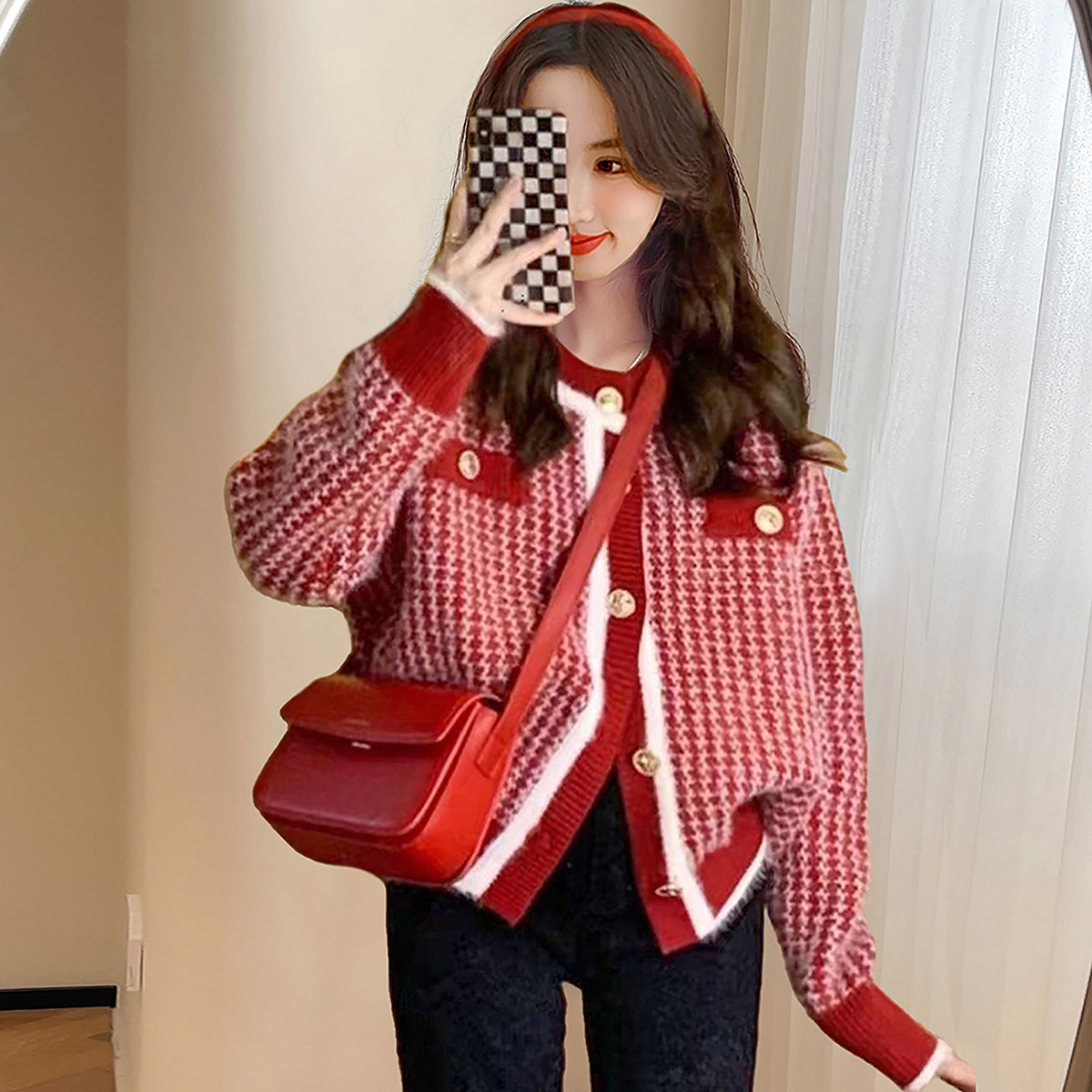 唐狮秋冬季女毛衣小香风绒感开衫外套短款红色系甜美可爱tu