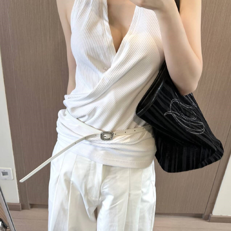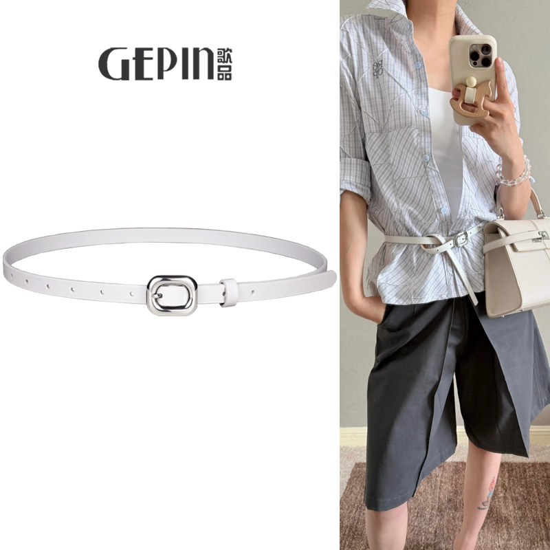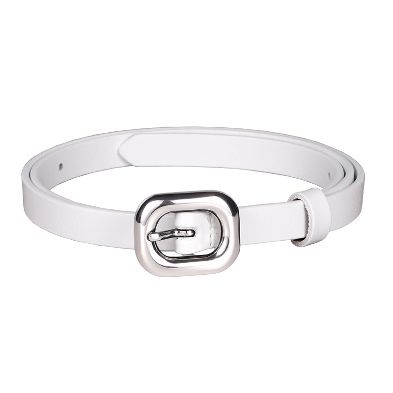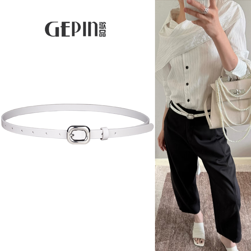 白色真皮细腰带女银色金属扣头配饰牛仔裤小众设计简约高级感皮带