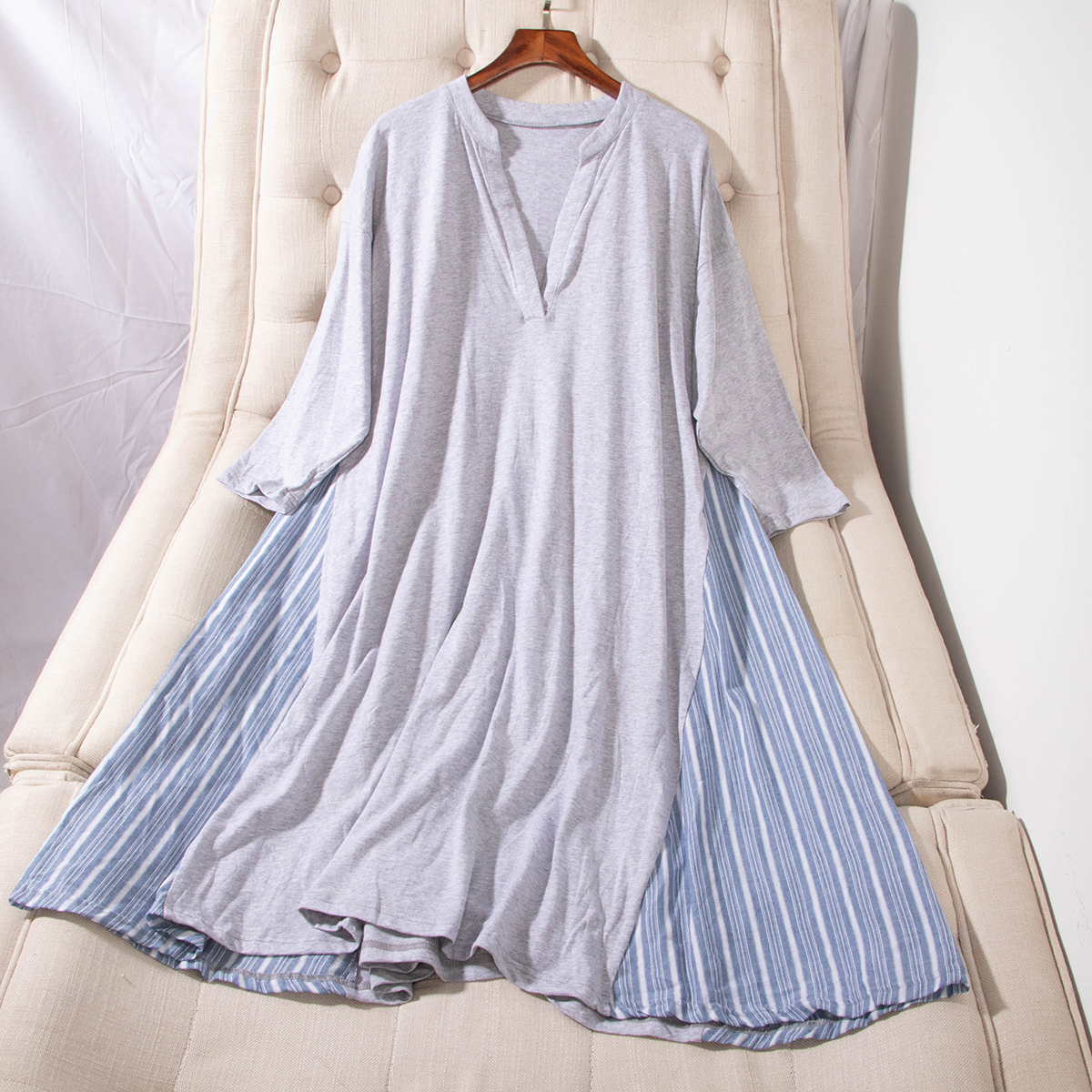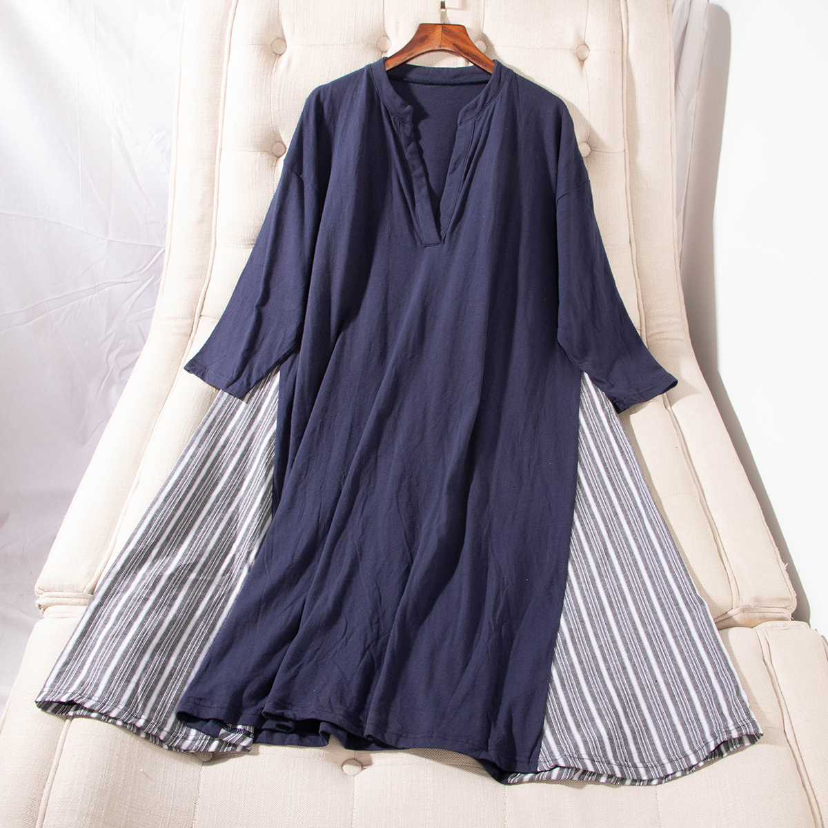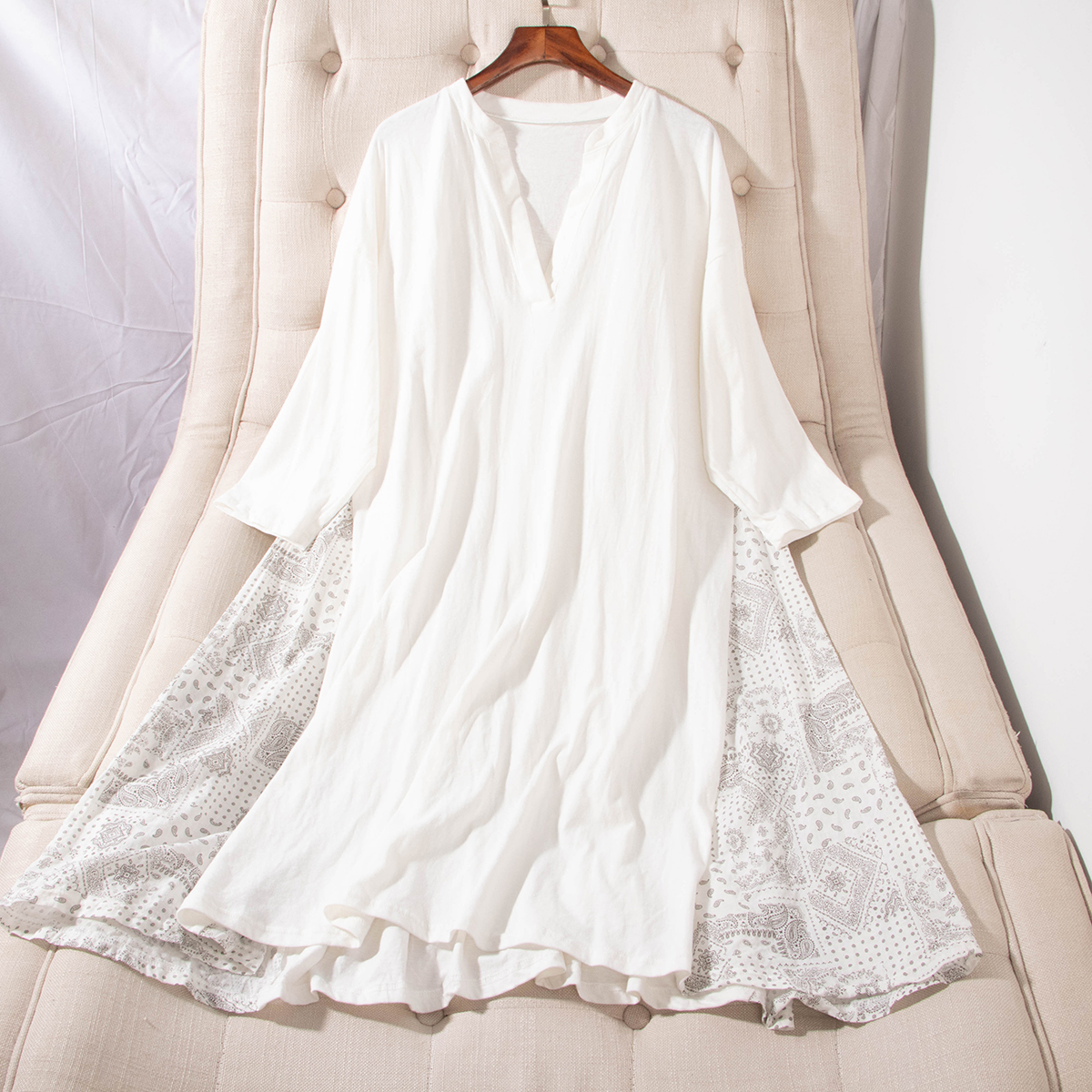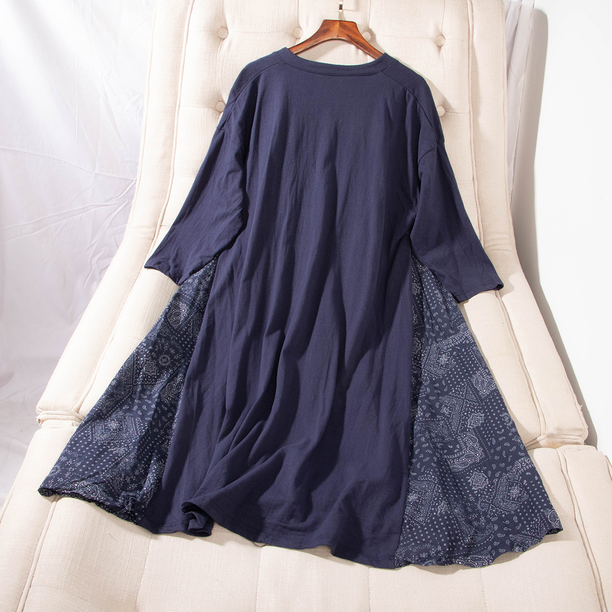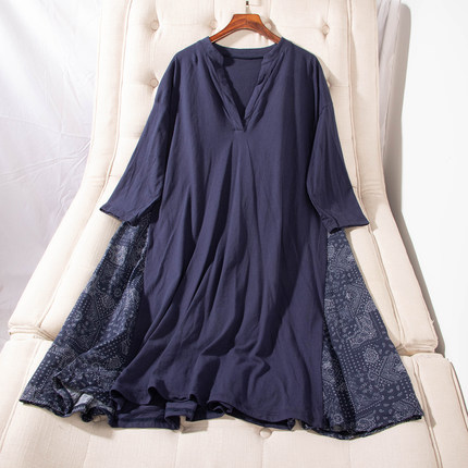 超值!日单春秋民族风文艺深V领侧边花纹拼接宽松大版连衣裙29759