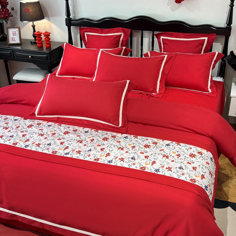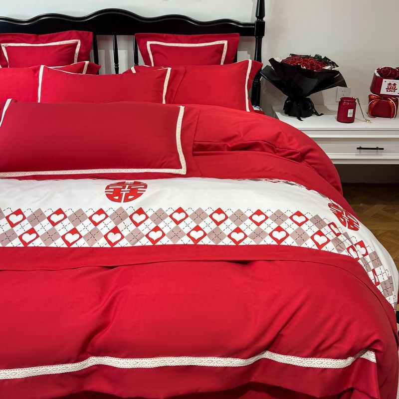 100支长绒棉结婚四件套大红色全棉陪嫁喜被套床单床上用品