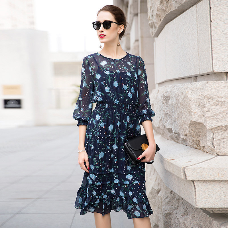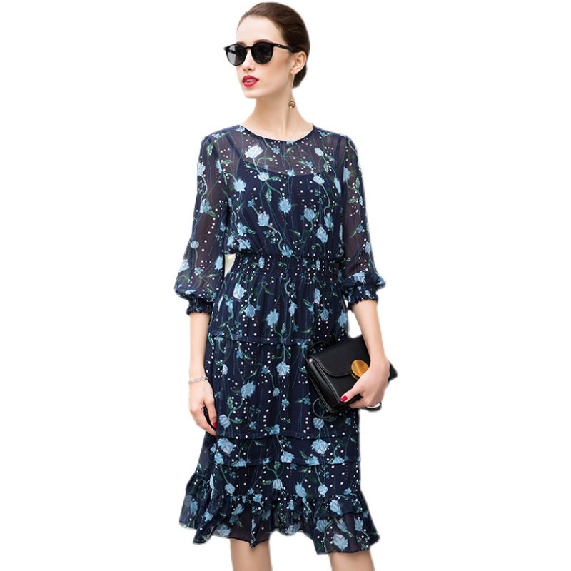 真丝桑蚕丝连衣裙印花蛋糕裙修身