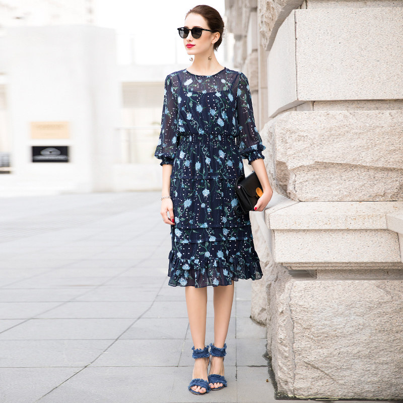品牌正品断码清仓真丝连衣裙碎花桑蚕丝蛋糕裙灯笼袖收腰显瘦长款