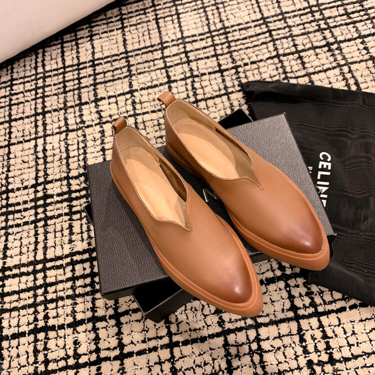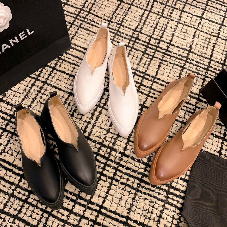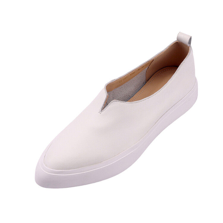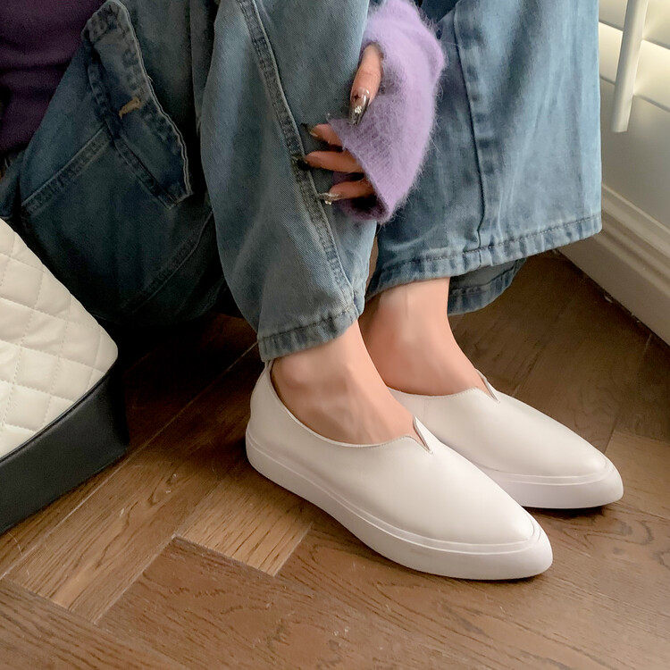 单鞋女夏季平底软底舒适V口尖头一脚蹬乐福鞋厚底真皮软皮小白鞋
