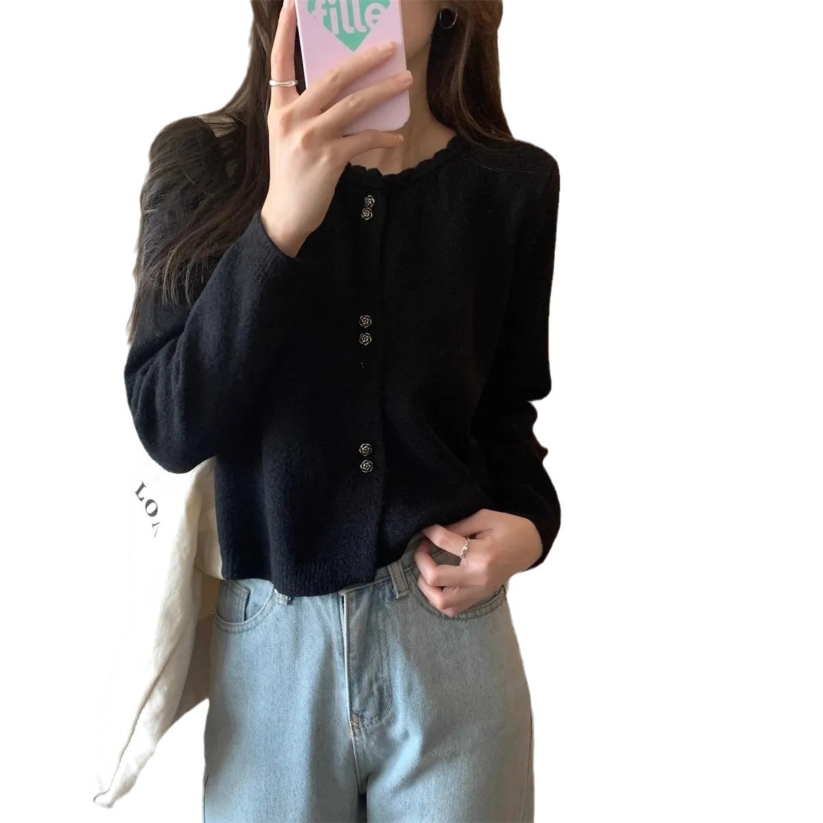 春秋季新款针织开衫毛衣女宽松韩版百搭短款法式复古圆领长袖外套
