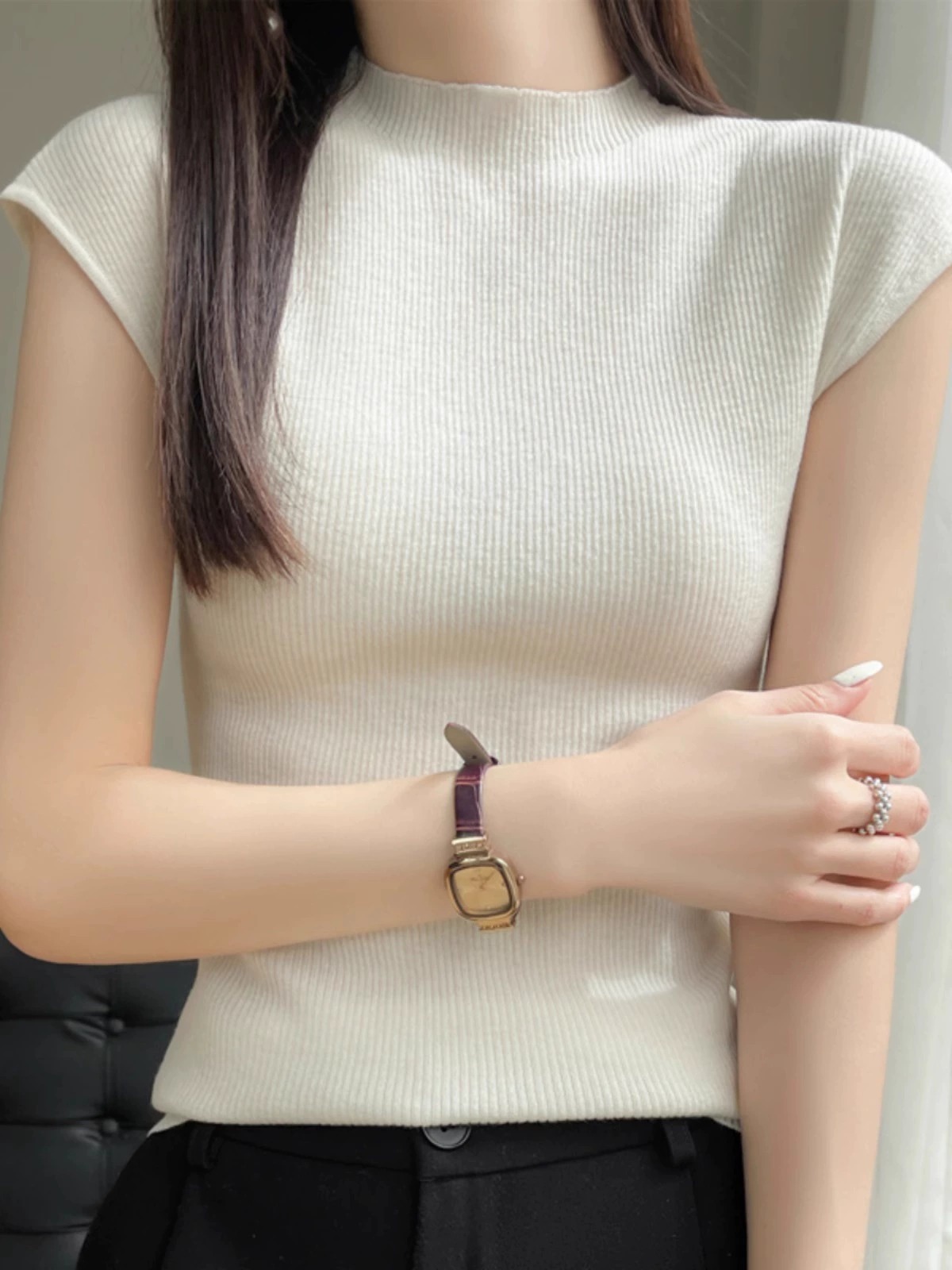 新款2024复古小飞袖半高领短袖t袖修身显瘦包袖针织衫内搭打底衫
