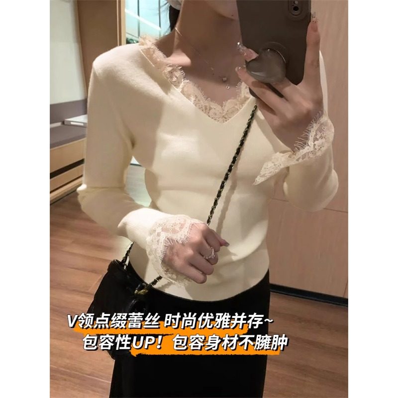 V领蕾丝针织打底衫女加绒加厚一体绒内搭2025新款秋冬季洋气上衣