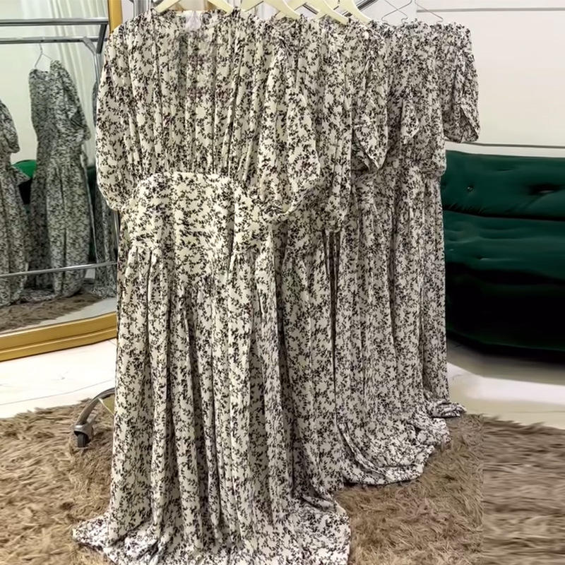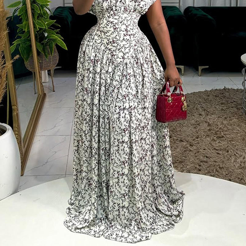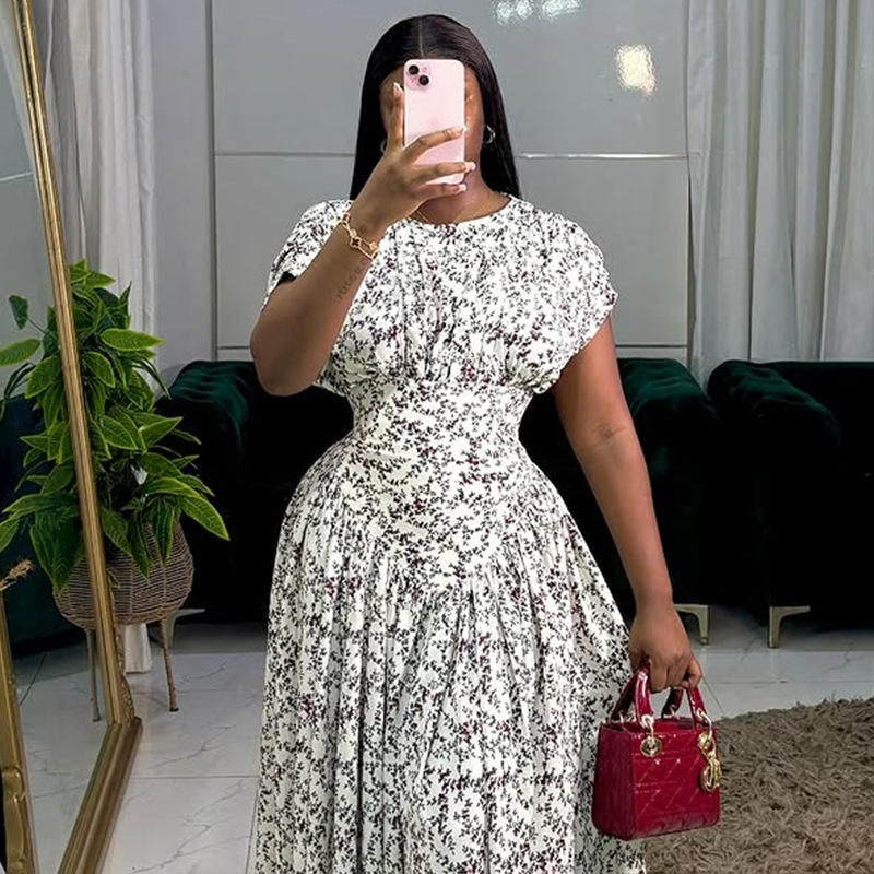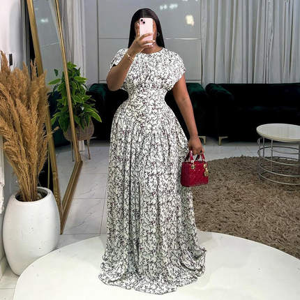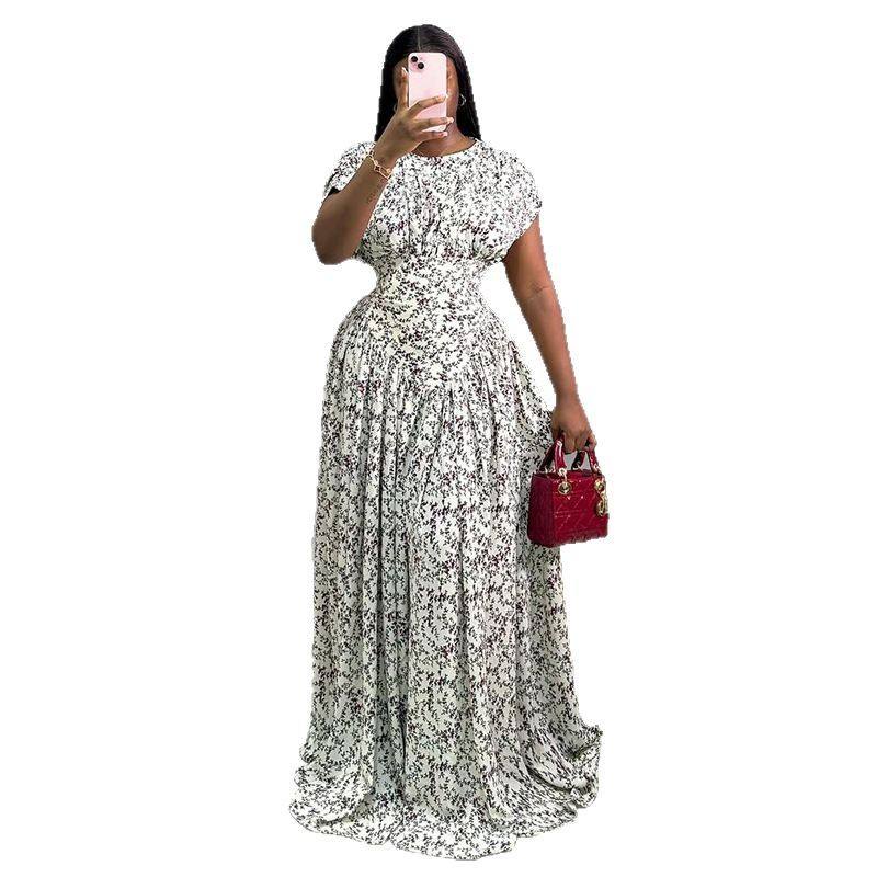 欧美2025夏季气质圆领印花收腰长裙大摆裙短袖连衣裙基本款