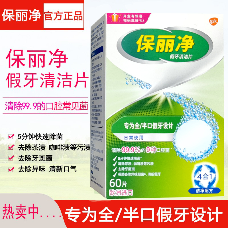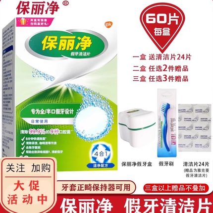 保丽净假牙清洁片60片+24 老年义齿清洗口腔清洁剂泡腾片异味洗白