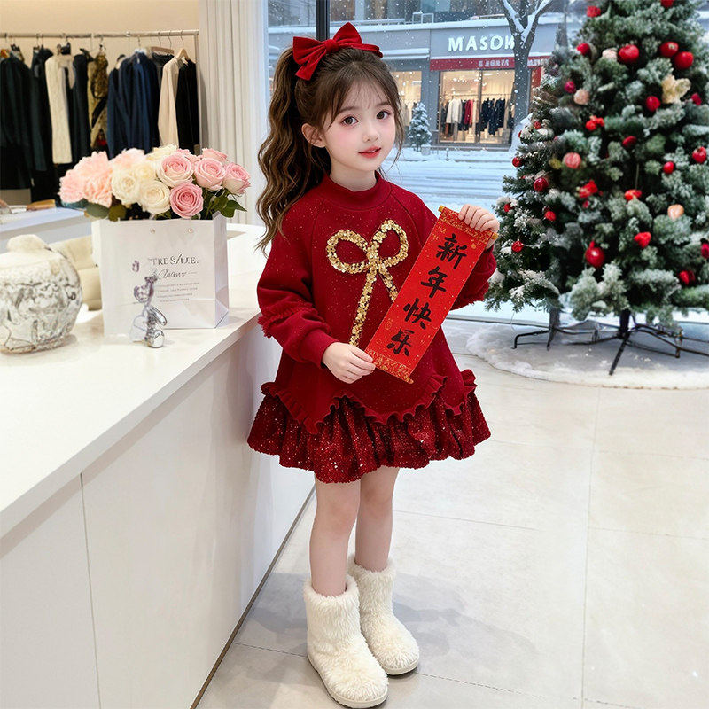 女童新年连衣裙冬季2026新款儿童加绒卫衣裙中大童冬装红色拜年服