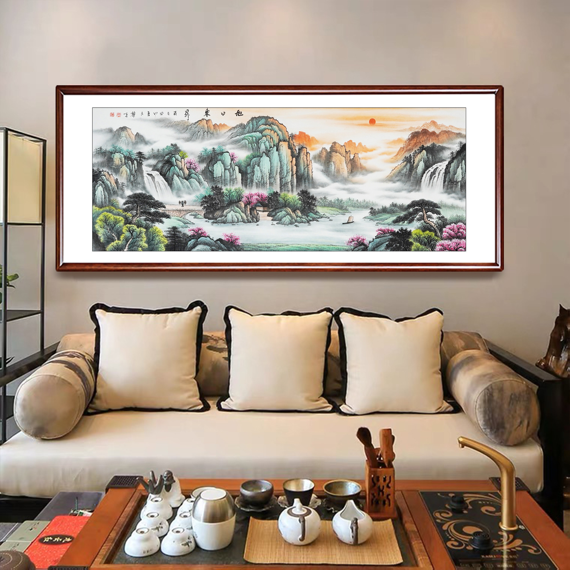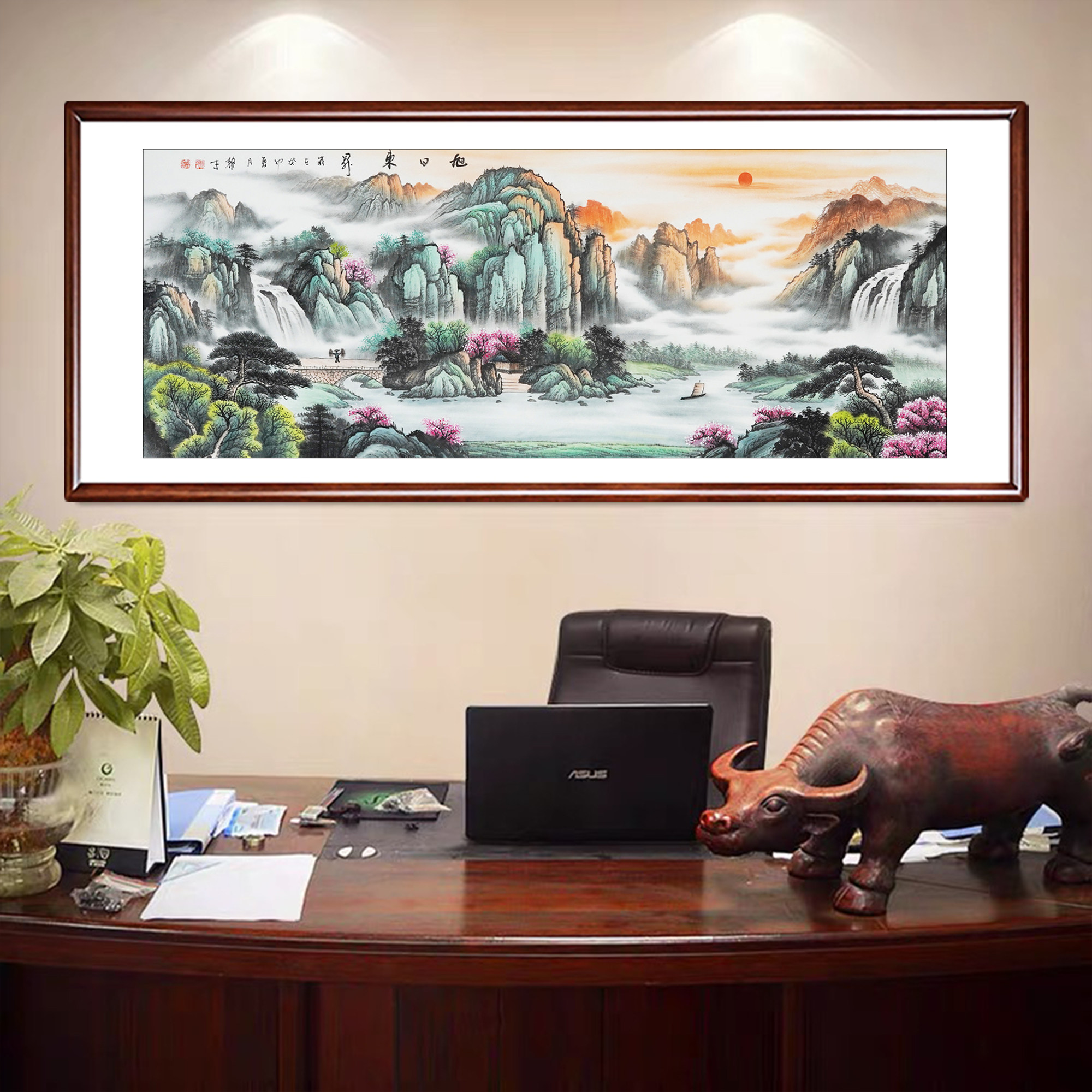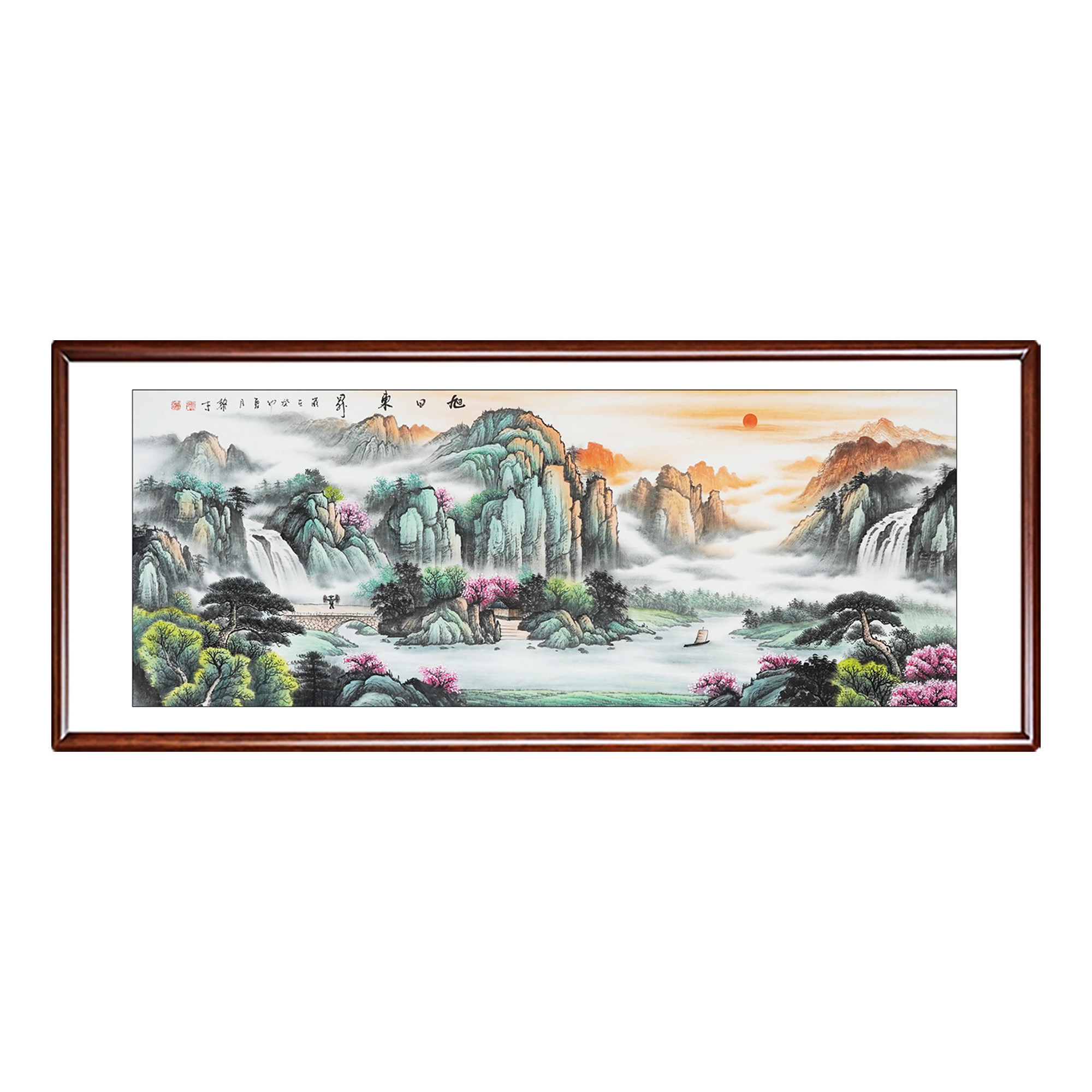 纯手绘旭日东升国画山水画中式客厅沙发聚宝盆办公室风水画装饰画