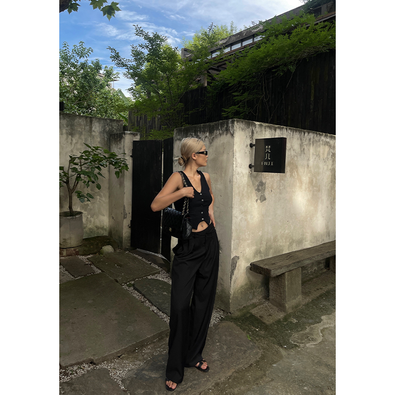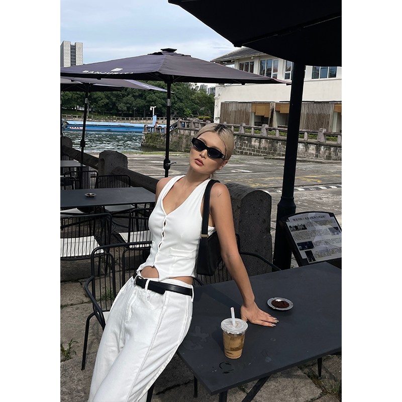 井也 无袖V领针织开衫女2023夏新款修身显瘦短款系扣背心马甲上衣