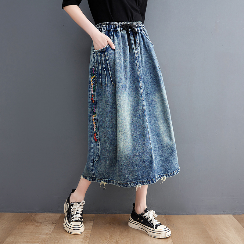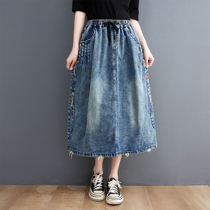 复古民族b风刺绣牛仔半身裙女宽松大尺码抽绳松紧腰遮跨显瘦a字裙