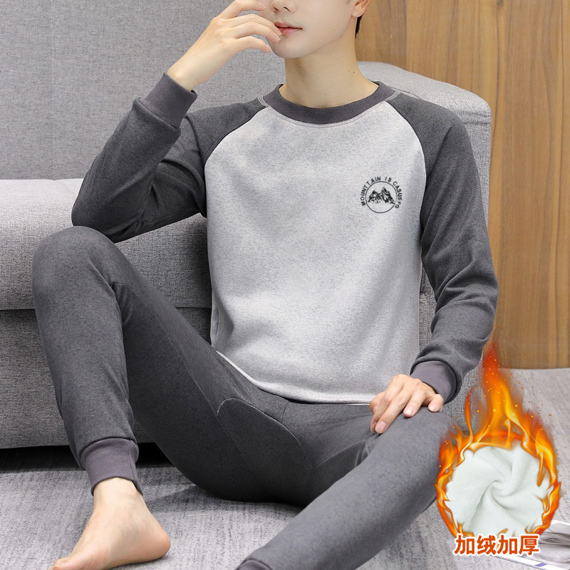 冬季保暖内衣男加绒加厚青少年高中初中学生大童秋衣秋裤圆领套装
