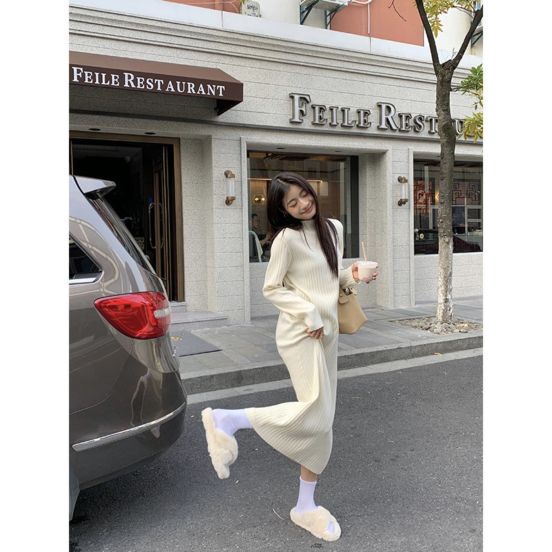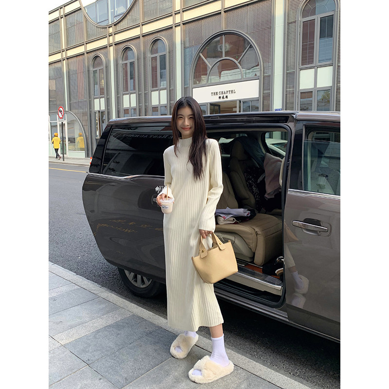 【郭九九呢】直筒宽松半高领毛衣针织连衣裙女秋冬新款打底长裙子