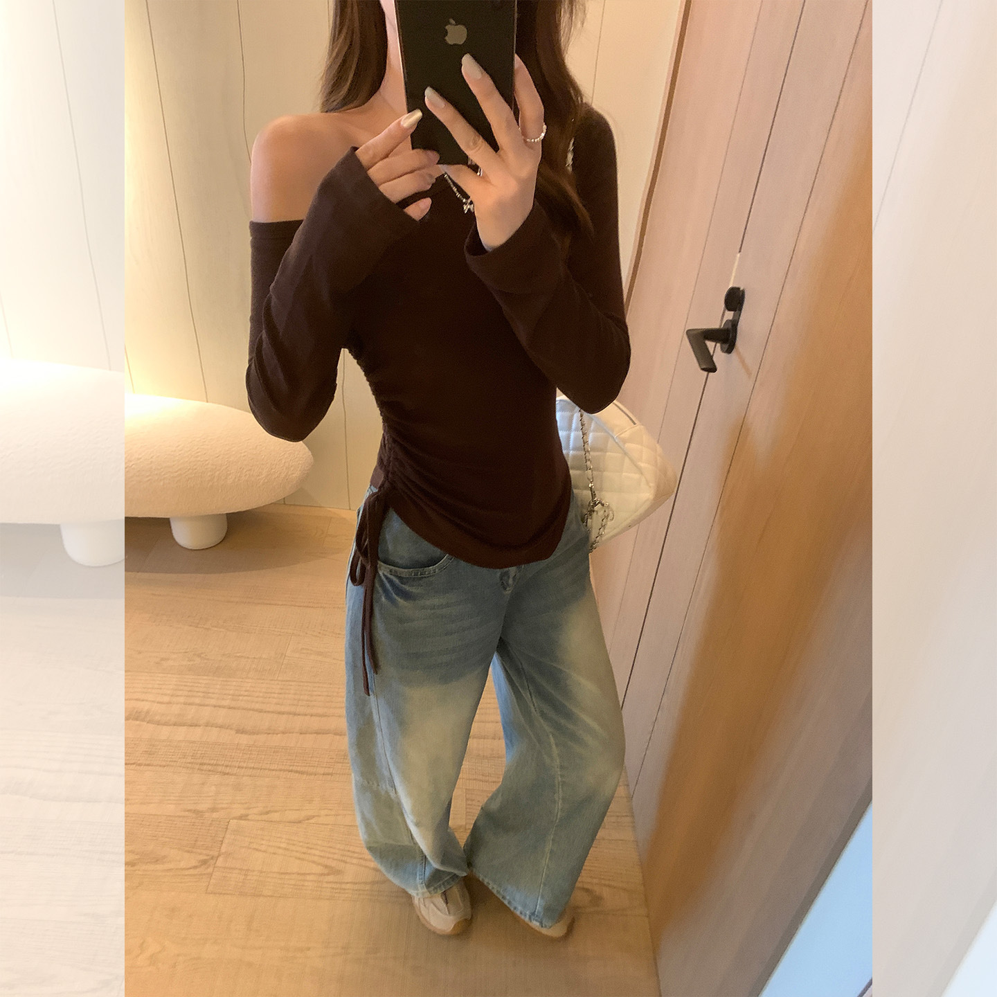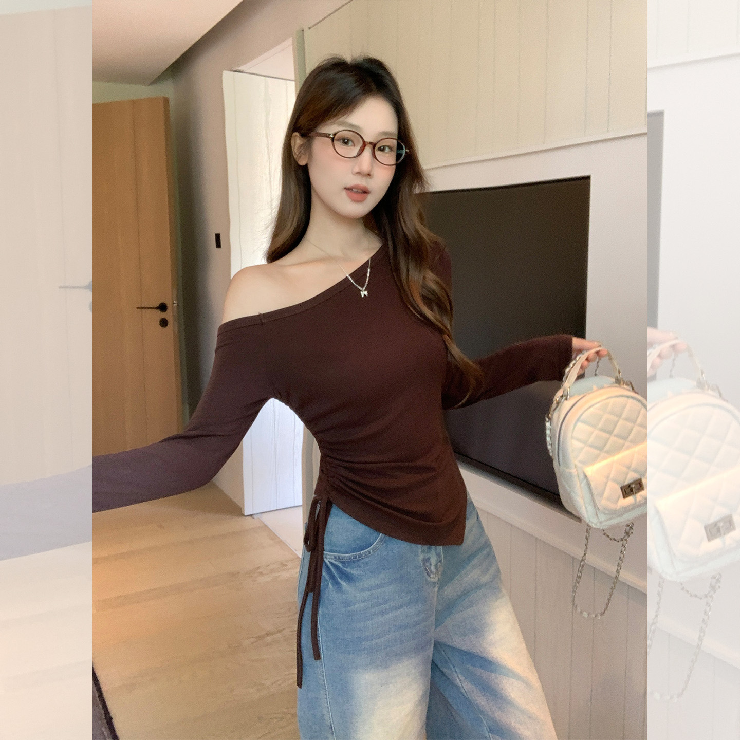 白色斜肩露肩打底衫长袖T恤女韩系早秋穿搭抽褶收腰显瘦内搭上衣