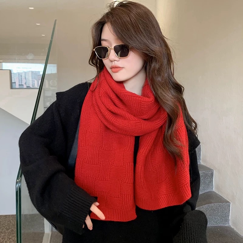 纯色墨绿色小香风格子毛线针织围巾女冬季红色格纹送男生保暖围脖