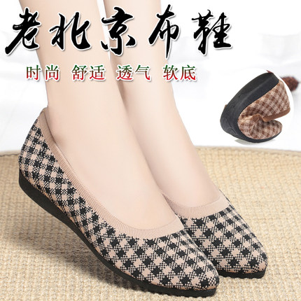 老北京布鞋女单鞋春夏秋季飞织布面妈妈鞋平跟软底透气百搭格子鞋