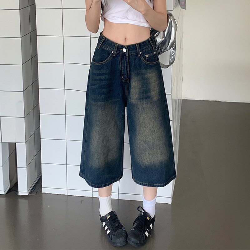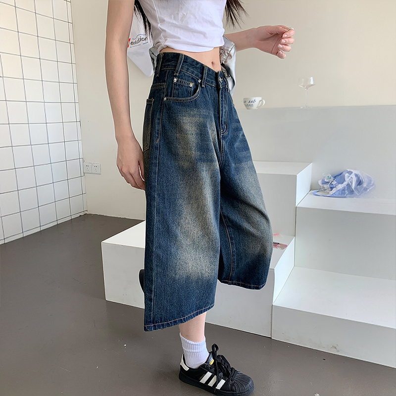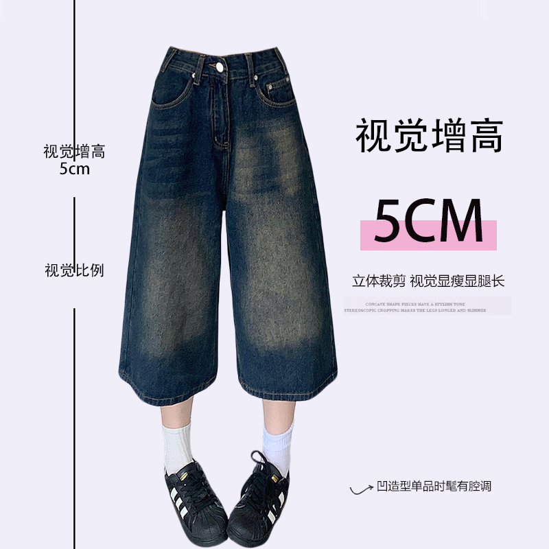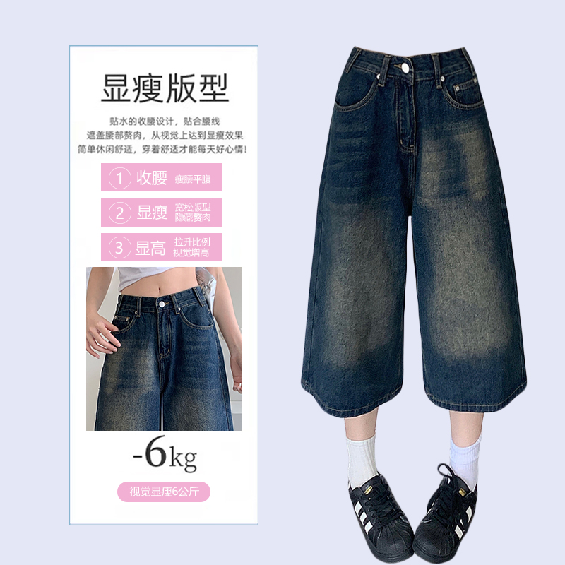 300斤特大码胖mm复古做旧水洗牛仔短裤女高腰直筒宽松休闲七分裤