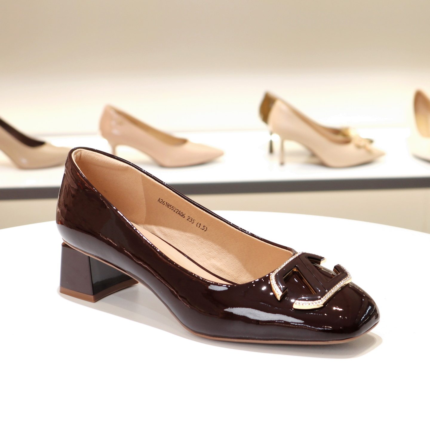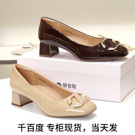 千百度2026静音鞋方头粗跟双C水钻牛漆皮浅口单鞋女A26185522A06