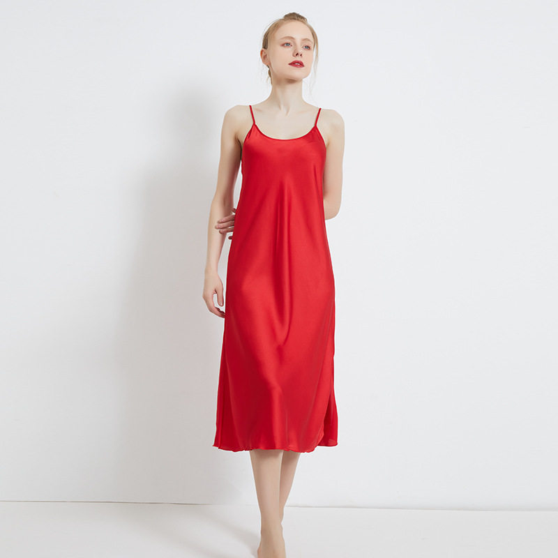 跨境大码吊带睡衣女夏女士冰丝丝绸睡裙性感长款skirt开叉连衣裙