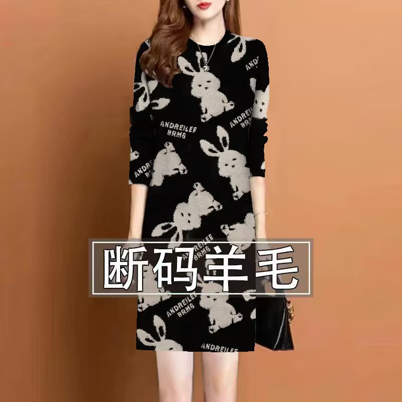 羊毛连衣裙春秋女印花毛衣秋冬气质妈妈大码针织保暖中长款打底衫