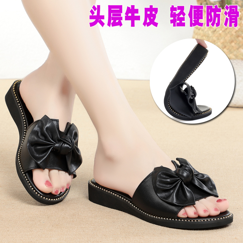 蝴蝶结凉拖鞋女外穿夏2021年新款时尚真皮女鞋平底软底外出半拖鞋