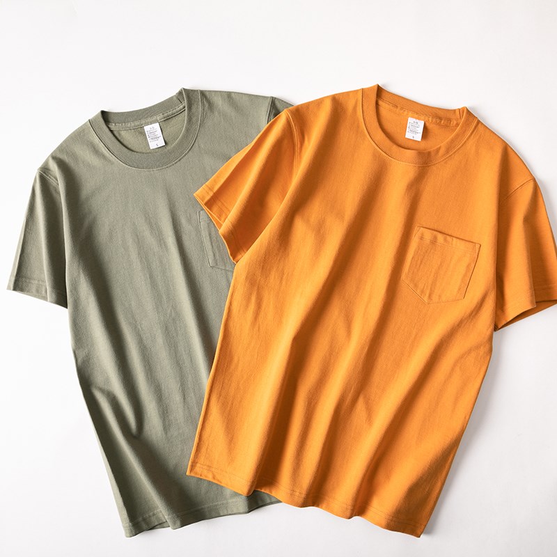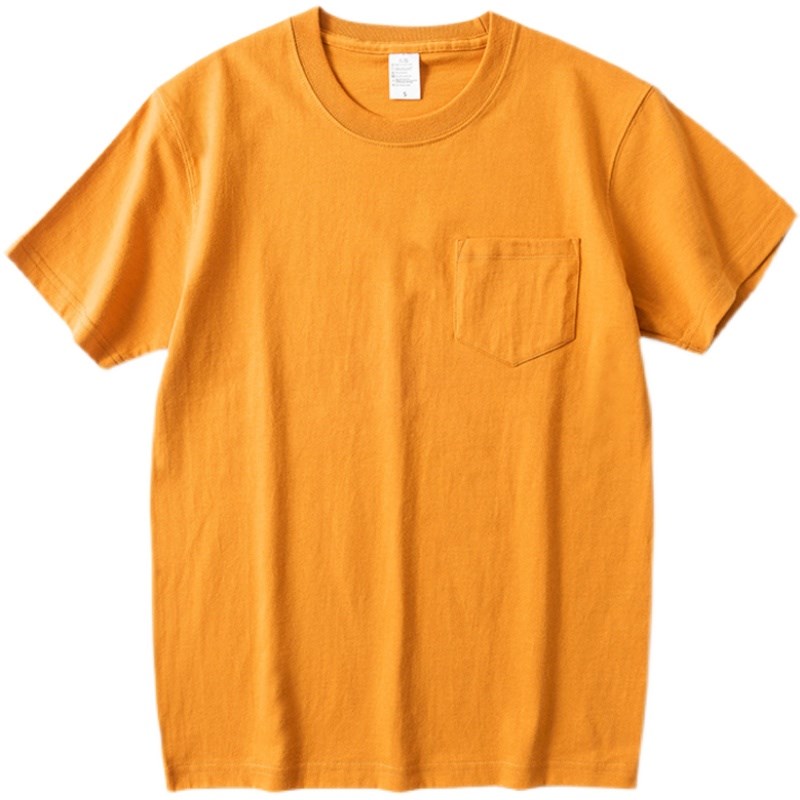 橘黄色270g重磅纯棉短袖口袋t恤 褐绿色咔叽复古纯色宽松体恤男女