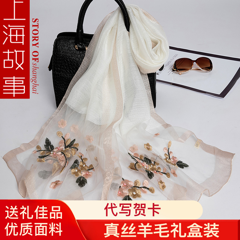 上海故事真丝丝巾女冬季薄款桑蚕丝新款送妈妈苏绣纱巾礼盒装正品
