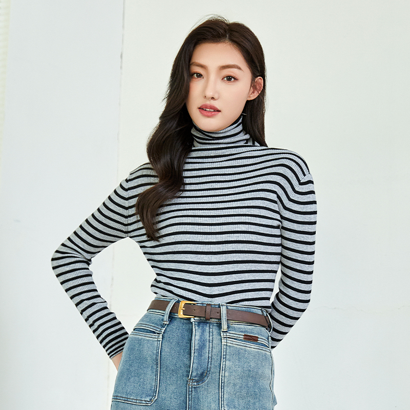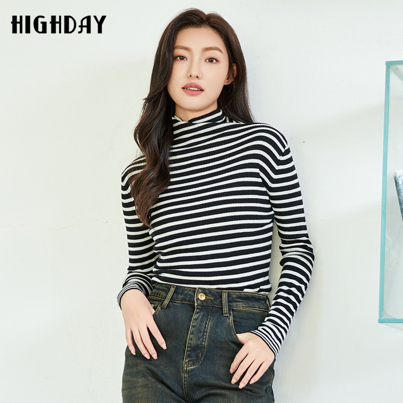 highday轩日2024冬季新款高领修身长袖打底衫女复古条纹针织毛衫