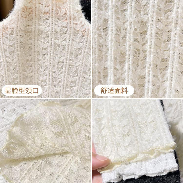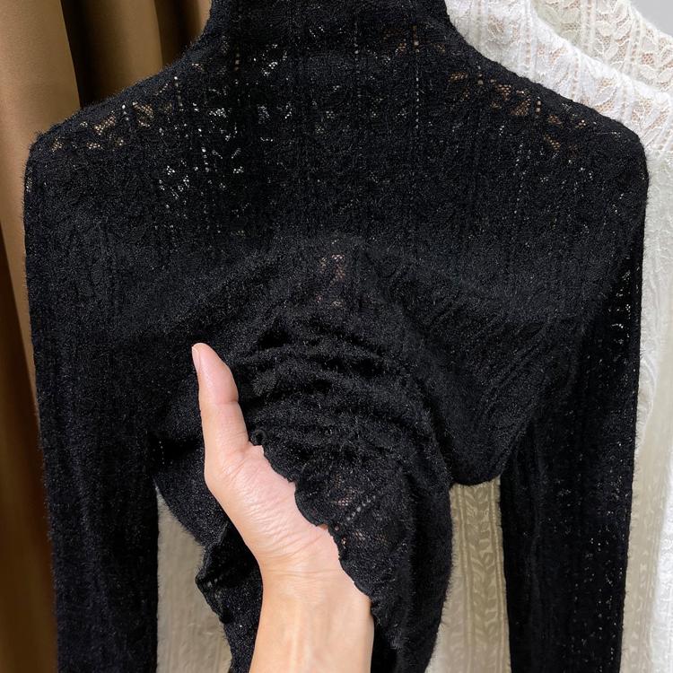 木耳边磨毛打底衫女春秋2024新款半高领蕾丝内搭小衫薄款镂空上衣