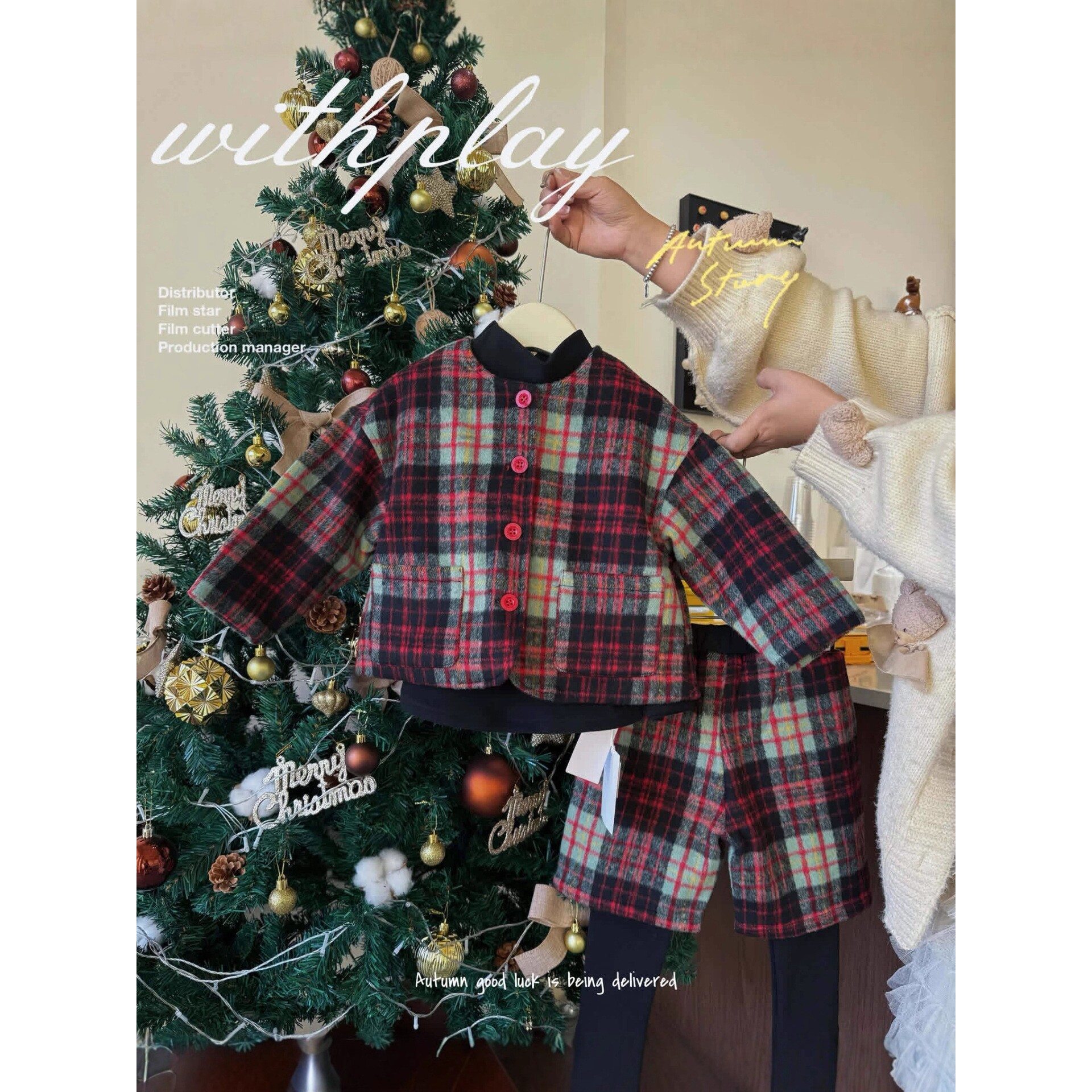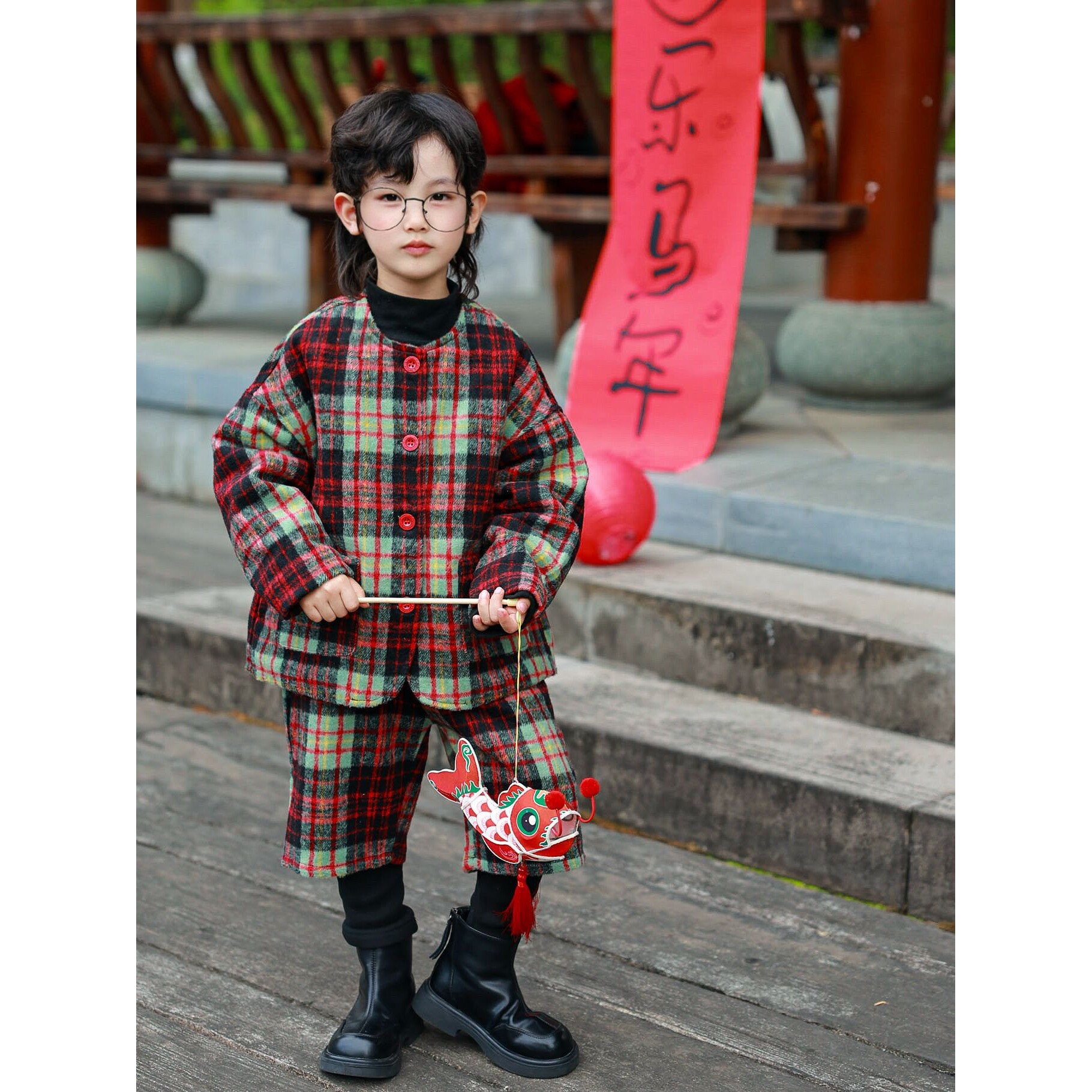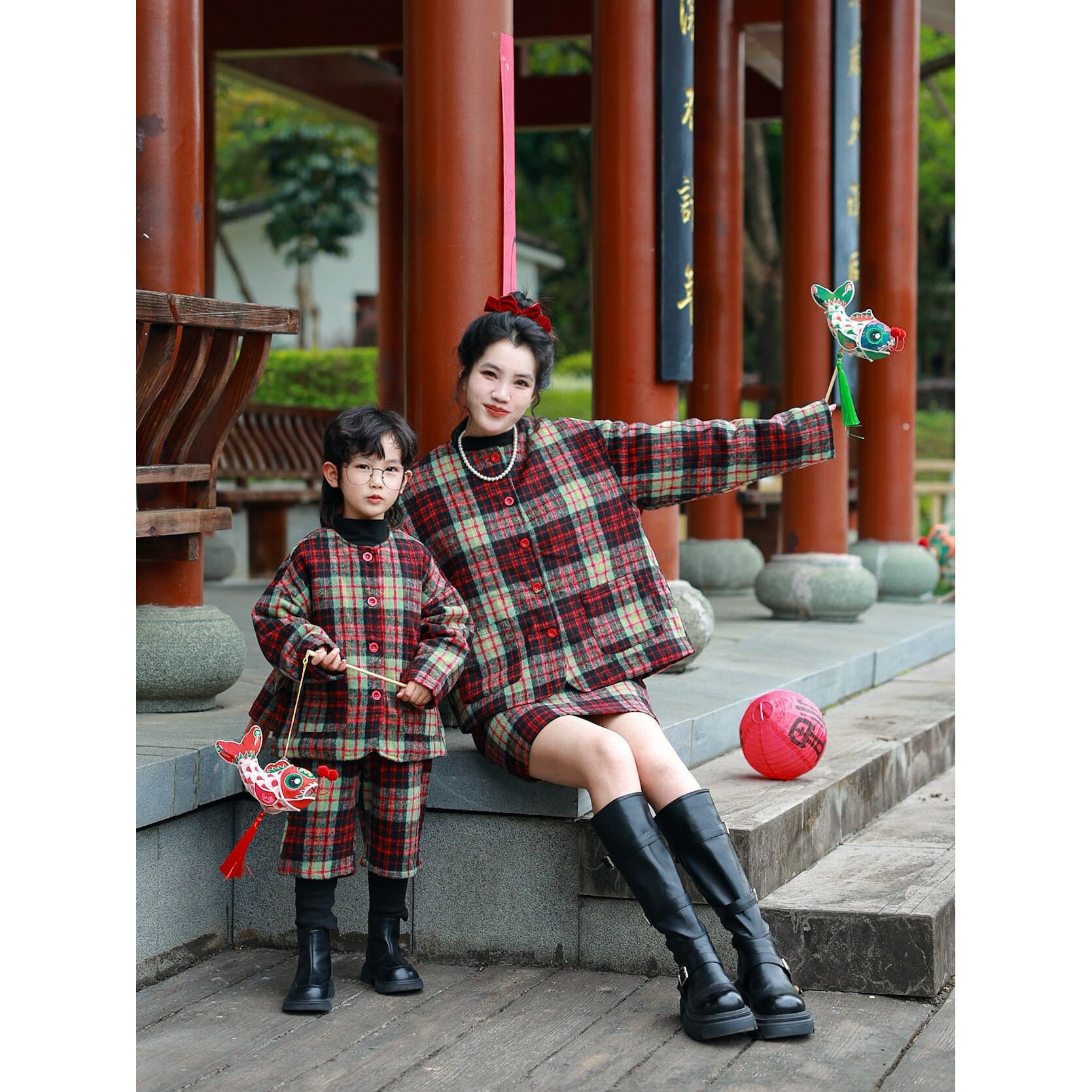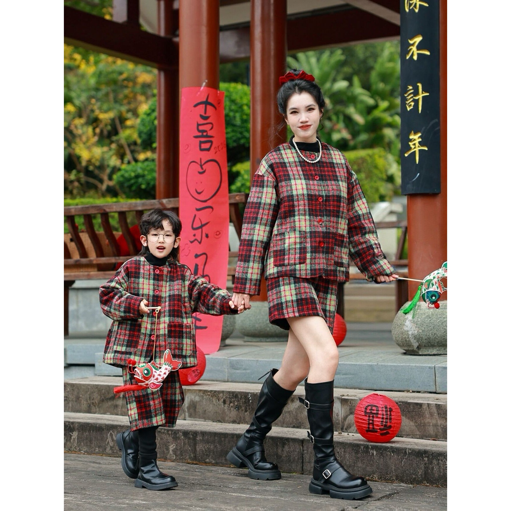 进口一起玩亲子双蛋新年格子套装韩系母子装加绒夹棉拜年新年套