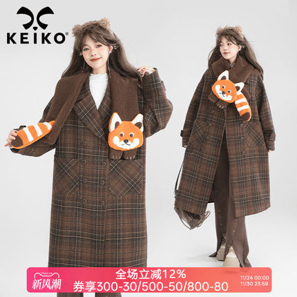 KEIKO 通勤复古咖色格子毛呢大衣女25早春挺廓加厚西装领呢子外套
