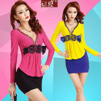 新款性感大码连衣裙低胸显瘦露背手工钉珠拼色夜店女装长袖秋冬款