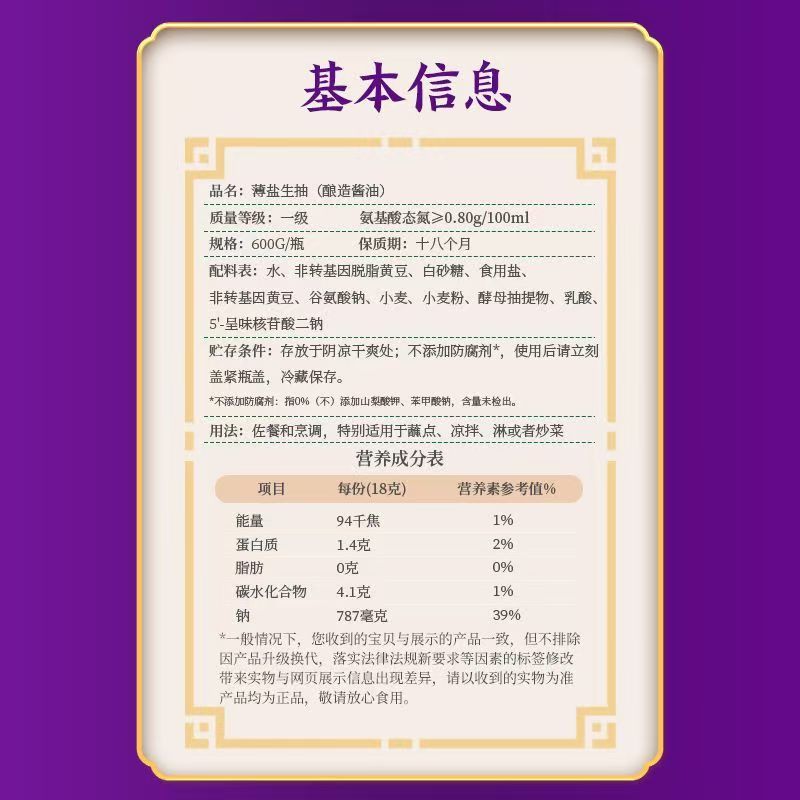 家庭厨房美食烹饪李锦记薄盐生抽600g健康减盐调味品