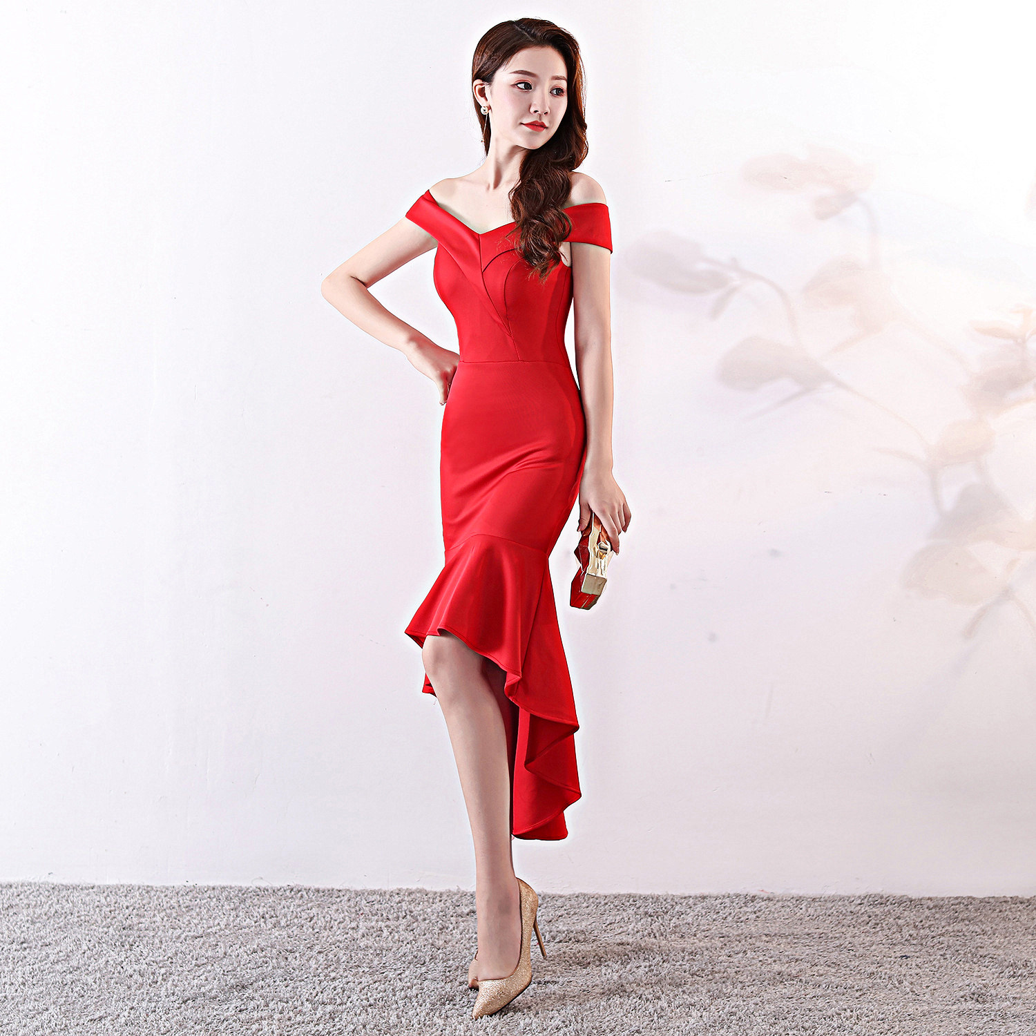 2025新款鱼尾气质轻奢高级感晚礼服女中长款一字肩红色性感连衣裙